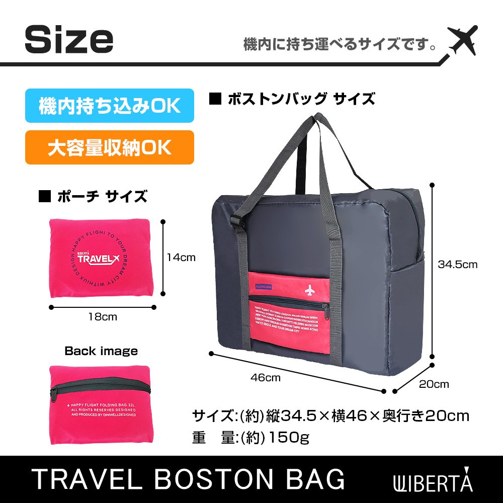 Boston bag (when deployed): (approx) length 34.5 × 46 × depth 20 cm