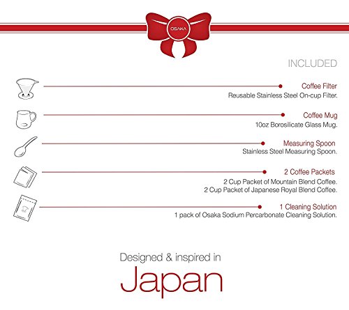 -. Brand : Osaka -. Color : Clear -. EAN : 0735255283877 -. Feature : ENJOY/GIVE THE GIFT OF COFFEE: Beautifully packaged gift set, with everything you need to join the latest coffee wave. / SET INCLUDES: 10oz Borosilicate Mug, On-cup Stainless Steel Filter, Stainless Steel Coffee Measuring Spoon, 2 Coffee Packets, A Cleaning Solution (for the filter). / LIMITED EDITION COFFEE BLENDS: 2 Cup Packet of Mountain Blend Coffee, 2 Cup Packet of JAPANESE ROYAL BLEND. / SEE BELOW FOR A DETAILED BREAKDOWN OF EACH PRODUCT / QUALITY GUARANTEED - Create a delicious coffee like a pro, with our detailed instructions and tips. For any defects in the materials or craftsmanship of any Osaka product, please contact our customer service team and we will be glad to assist you. -. Label : Osaka -. Manufacturer : Osaka -. Model : O-GS1 -. MPN : COMIN18JU049483 -. PackageQuantity : 1 -. PartNumber : COMIN18JU049483 -. ProductGroup : Kitchen -. ProductTypeName : KITCHEN -. Publisher : Osaka -. Studio : Osaka -. Title : Osaka, Pour Over Coffee Dripper Starter Set – Full Brewing Kit For Pourover Coffee Lovers; Mug, Filter, Measuring Spoon And Coffee Samplers - (10oz./296ml) Capacity -. UPC : 735255283877