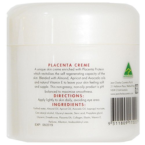 A unique skin creme enriched with Placenta Protein which revitalizes the self regenerating capacity of the skin. Blended with Almond, Apricot and Avocado oils and natural Vitamin E to leave your skin feelinf soft and supple. This non-greasy, non-oily product is pH balanced to maximise smoothness. Ingredients: Purified water, almond, apricot and avocado oils, isopropyl miristate, stearyl alcohol, steric acid, propylene glycol, glycerin, dimethicone, placenta extract, collagen, elastin, vitamin E, fragrance, allantoin, imidizolidinyl ureaFeature