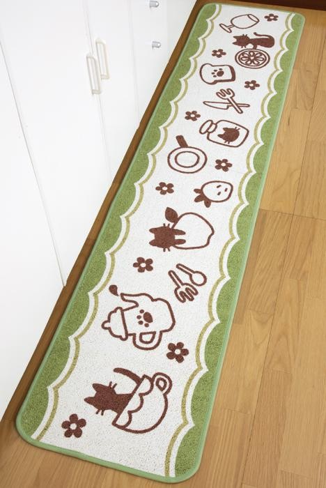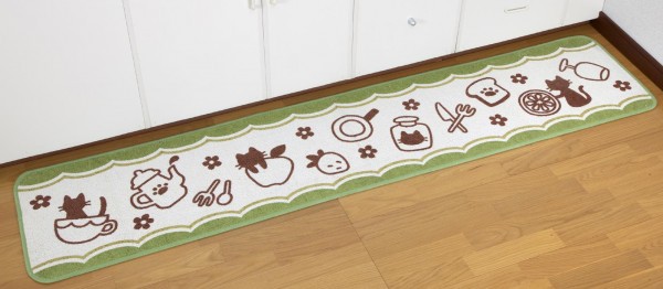 キッチンツールとネコのデザインが楽しいキュートなキッチンマットです。裏面に滑りにくい加工を施しているので、横ズレしにくいです!!