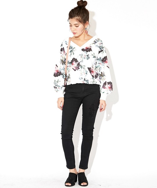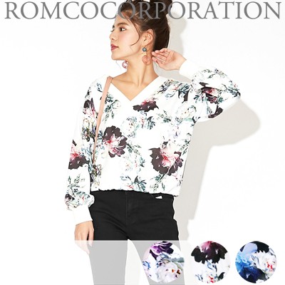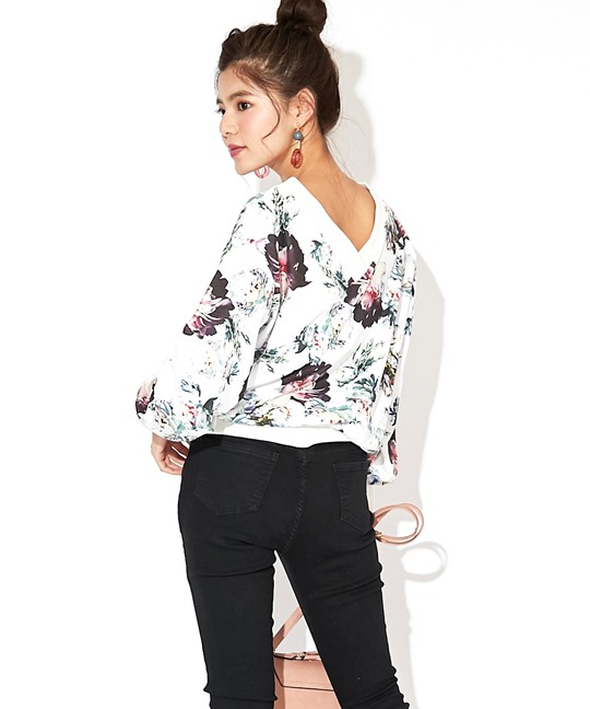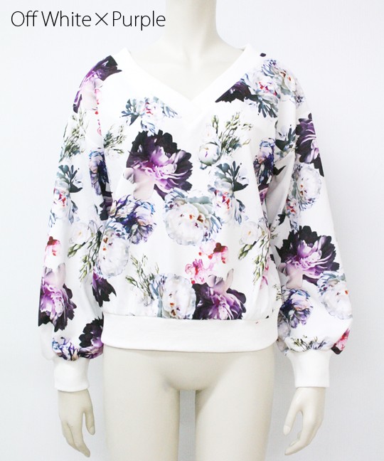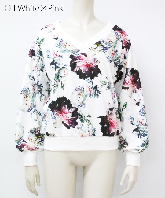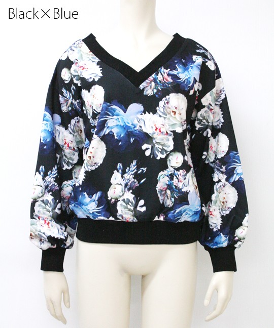 首回りすっきりVネックトップス大きめ花柄が目を引くトップスです