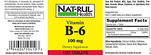 Studio : NAT-RUL Publisher : NAT-RUL Binding : Health and Beauty Product Description B-6 (Pyridoxine) is necessary for absorption of carbohydrates, fat and proteins. Helps maintain the chemical balance among body fluids. Plays a role in converting food into energy. ‡ ‡ This statement has not been evaluated by the FDA. This product is not intended to diagnose, treat, cure or prevent any disease. No Yeast ? No Corn ? No Soy ? No Rye ? No Barley No Milk ? No Sugar ? No Starch ? No Preservatives No Artificial Colors or Flavors 0