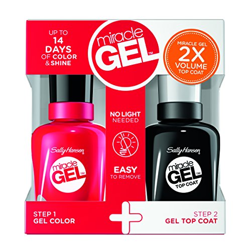 Over 61 shades that wow! And it's only from Sally Hansen. Leading the revolution in gel technology. For Best Results: Make sure nails are clean and dry. Use nail polish remover to wipe away any residue on the nail. Step 1: Apply 2 coats of Miracle Gel Color. Allow color to dry for 5 minutes. Step 2: Apply 1 coat of Miracle Gel Top Coat. Let natural light do the rest!Feature