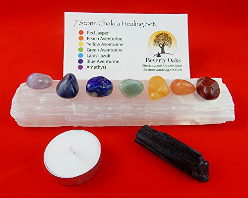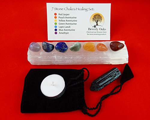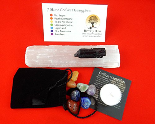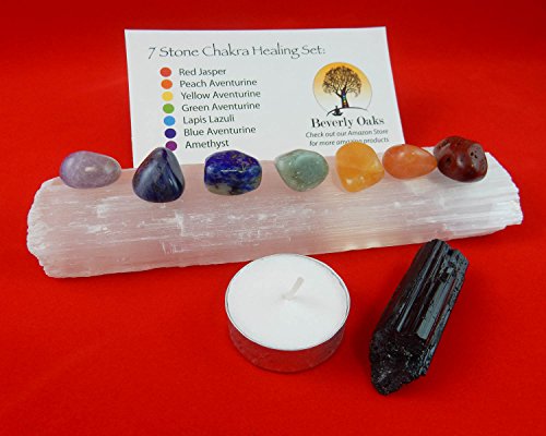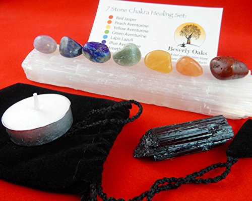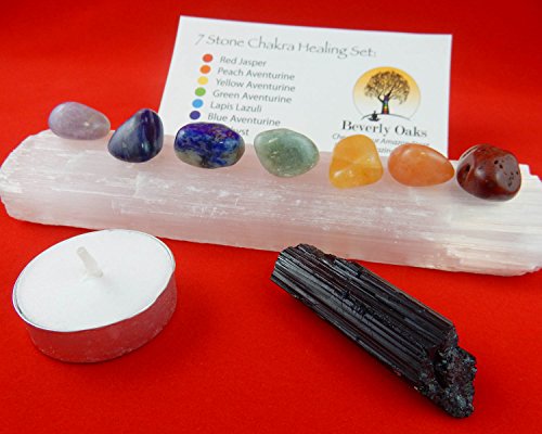 10 pc Chakra Crystal Healing Kit: Large Selenite Bar, 7 Chakra Natural Polished Tumbled Stones in black velvet bag with Chakra Information Card, Black Tourmaline Specimen, Votive, Beverly Oaks COA