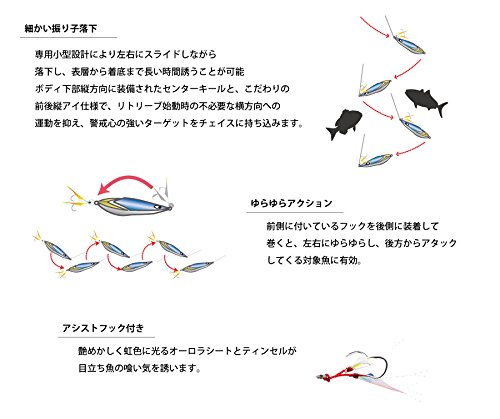 흔들이 낙하&한들한들 액션 지그 ●흔들이 낙하&한들한들 액션 지그.●오프쇼어(offshore)에 실적이 있는 솔 teeth《데지》에 skid 지그와《쇼아지긴구라이토지긴구》에 최적인 라인업이 신 등장.●낙하시에는,흔들이와 같이 움직임,감아서 꺼내어 때로는,좌우로 한들한들 움직이는 2way액션 지그.오로라 씨트와 T《세루》를 장비 했다, 어시스트 훅부에 물고기가 먹어 느낌을 권합니다.●《쇼아》부터의 캐스팅부터,《쇼아라인》의 천장소의 라이트 지깅에까지!