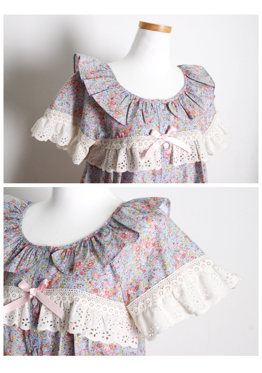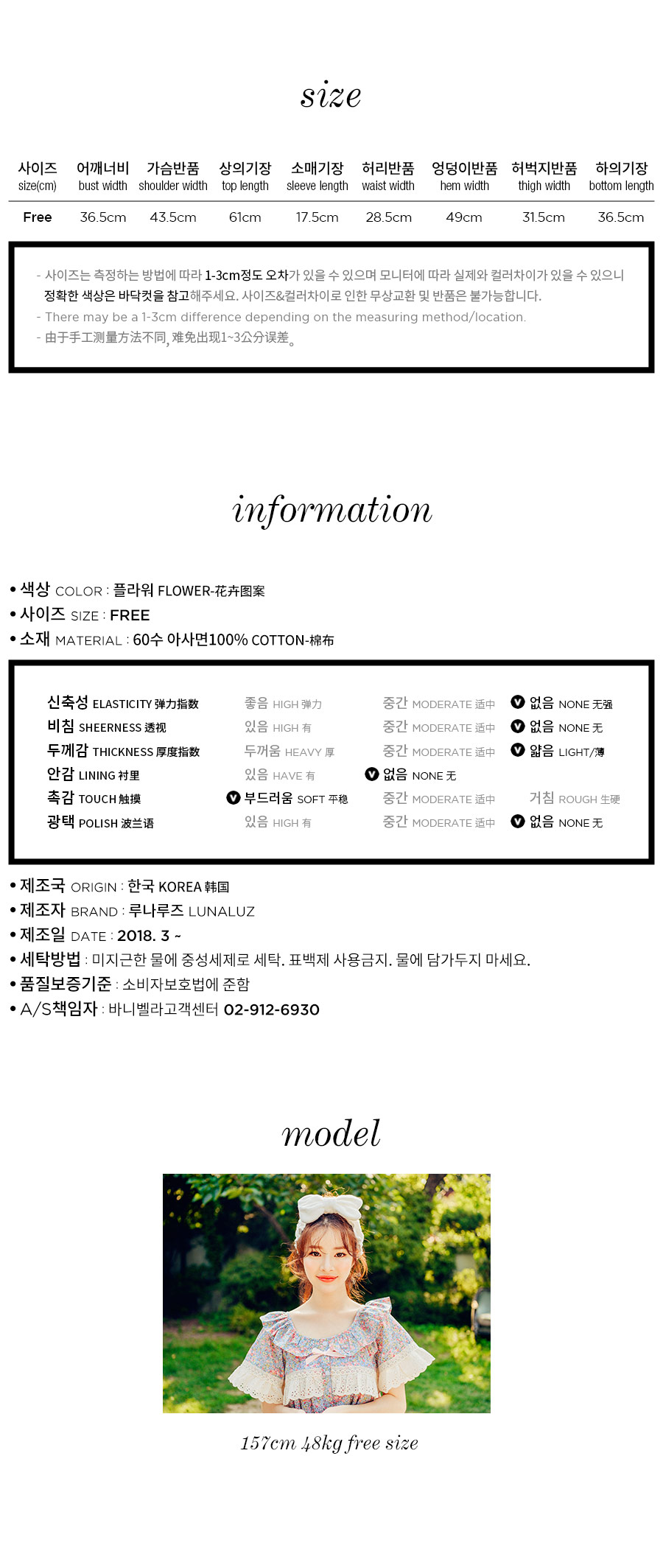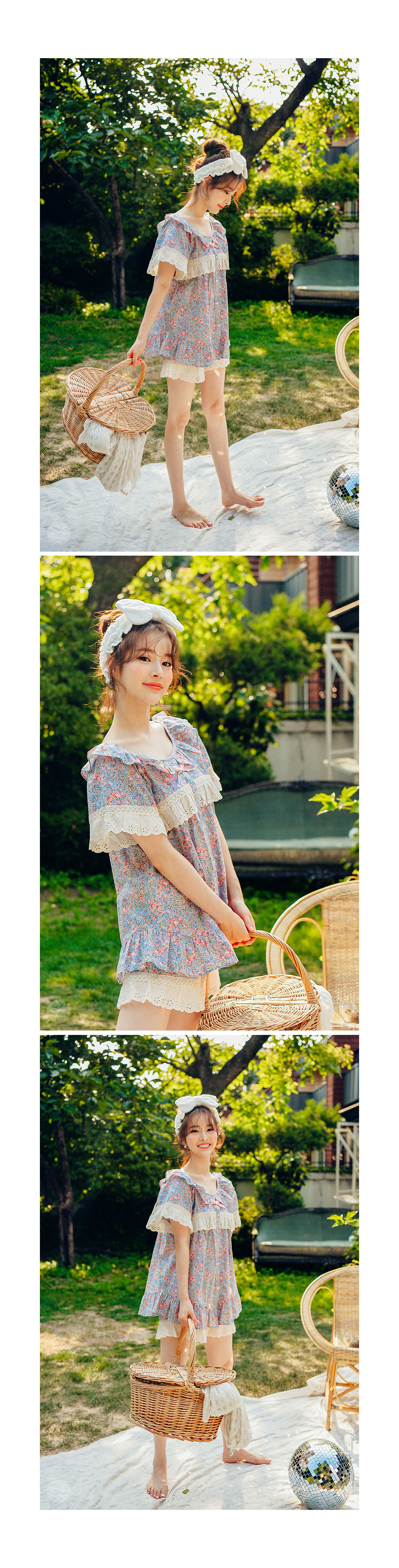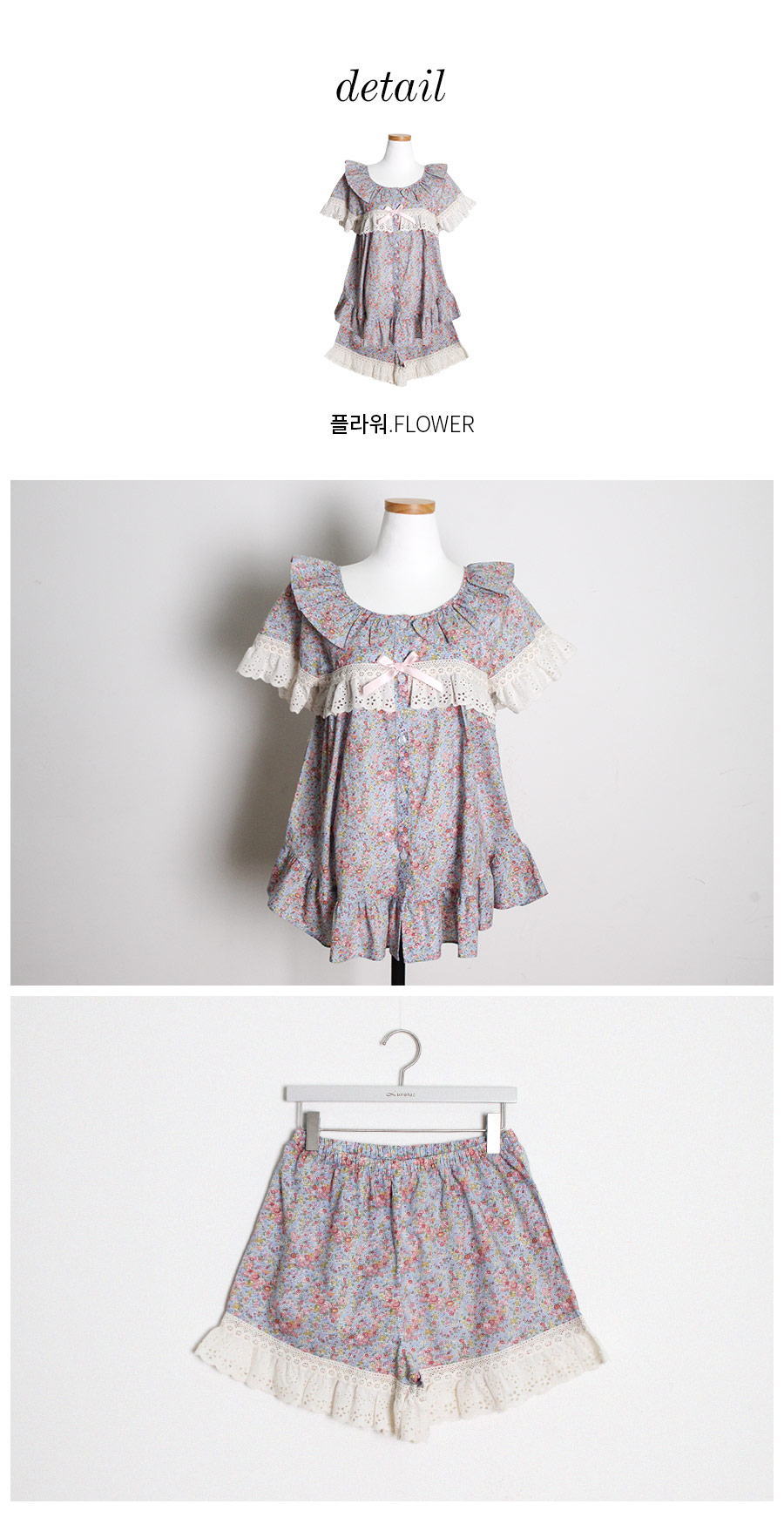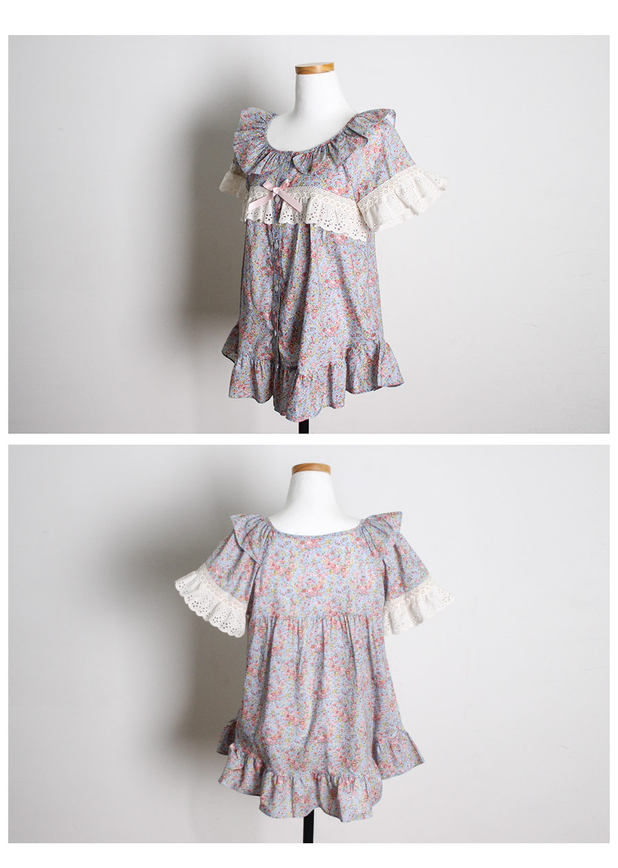 착용했을 때, 더 여성스러운 스타일의 잠옷입니다. 소프트한 컬러와 잔잔한 플라워 프린팅이 고급스러우면서 페미닌한 분위기를 내어줍니다. 재차 bt를 본 자체프린팅으로 소장가치가 높습니다. 소재는 60수 아사면으로 얇고 통기성이 우수합니다. 매끄럽고 은은한 광택이 돌며 피부에 닿는 느낌이 좋아 숙면을 취하시기 좋습니다. 로맨틱한 감성 잠옷으로 화사한 분위기가 감도는 스타일입니다. 강력추천 해드려요~! DETAIL 낙낙한 패턴으로 편안하게 착용하기 좋은 스타일의 룩인데요. 원단을 아끼지 않고, 요척을 많이 둬 착용감이 훨씬 좋습니다. 편안한 라운드 네크라인에 길고 풍성한 프릴을 봉제하고 소매의 끝단과 바스트 라인에 베이지 컬러의 각기 다른 면 레이스를 2중으로 봉제해 고급스럽게 디자인했습니다. 착용시 편안하고 예뻐 보이는 패턴으로 강력 추천 해드립니다. 전체 오픈형으로 탈착용이 편합니다. 팬츠는 3부 쇼츠 기장으로 동일하게 고가의 면레이스 장식을 봉제해 포인트를 주었습니다. 100%국내 제작으로 디자인, 소재, 봉제의 퀄리티가 높습니다. SIZE 여성 사이즈는 평균 44반~66반 size까지 커버 가능한 free사이즈 입니다.