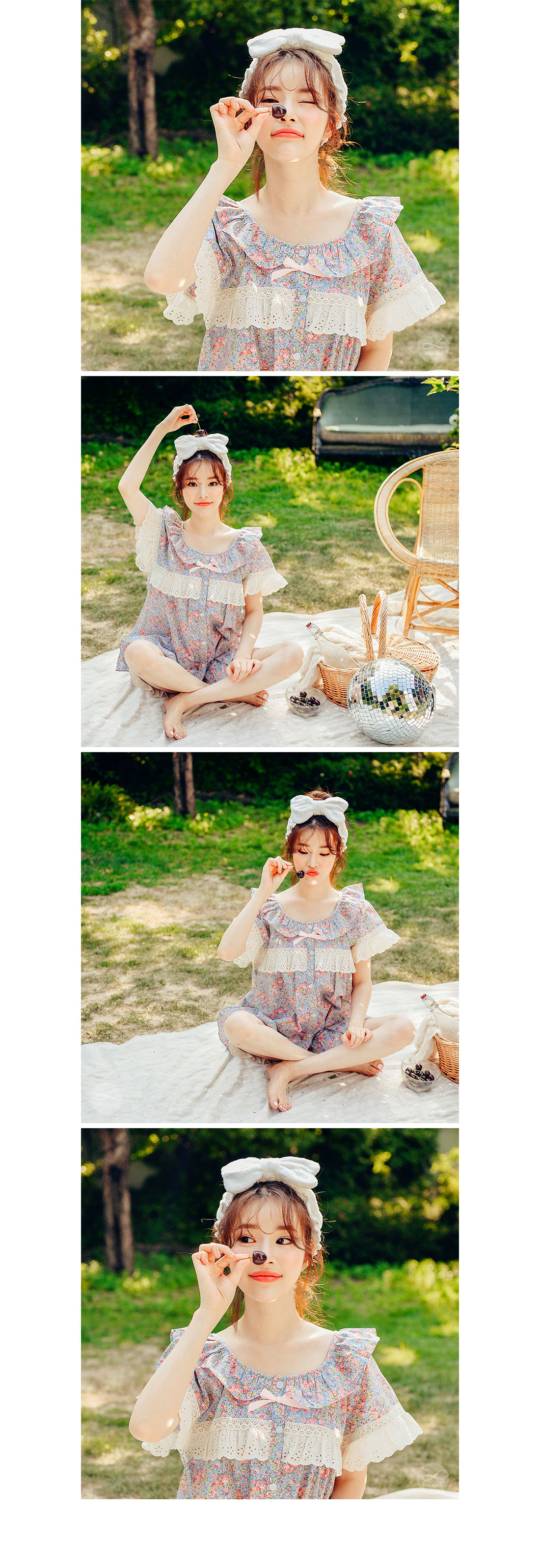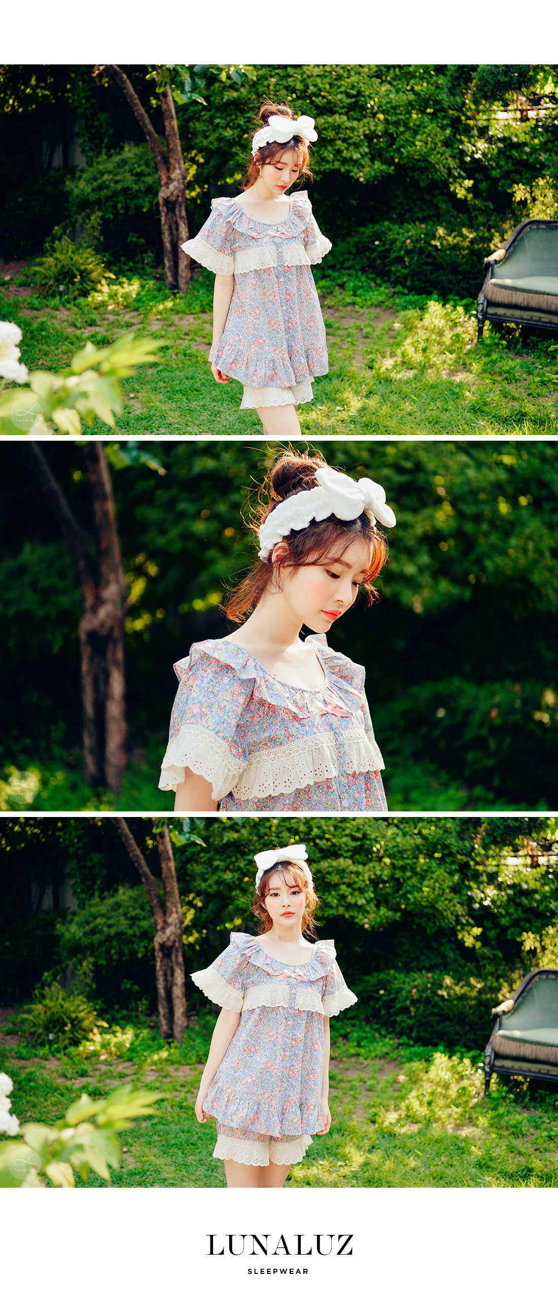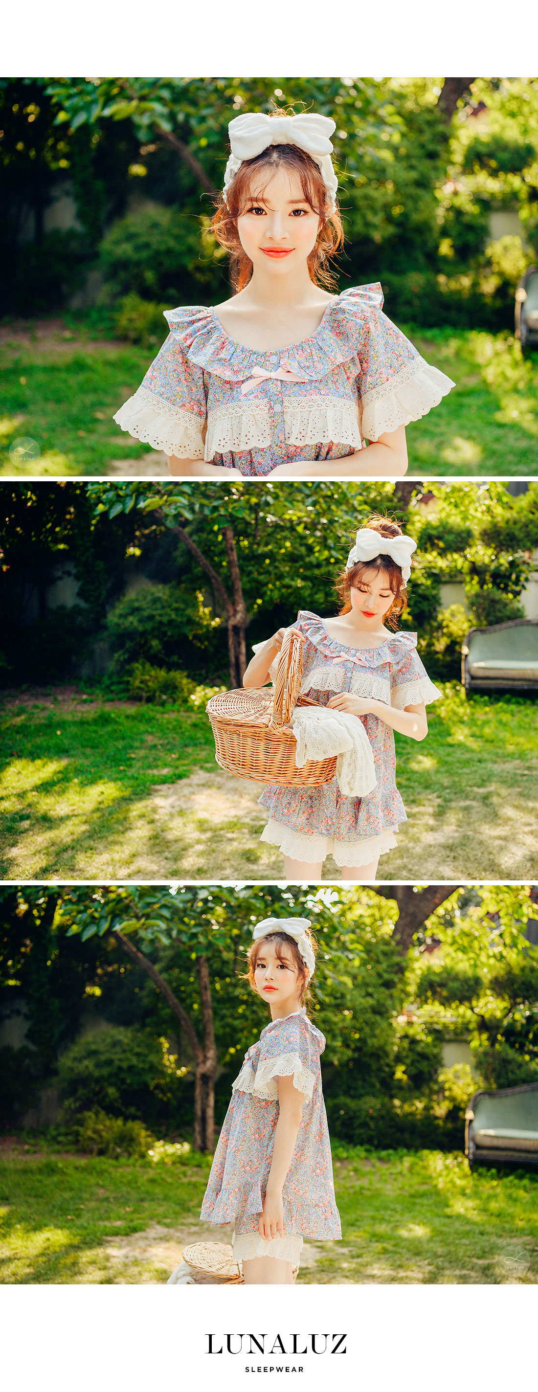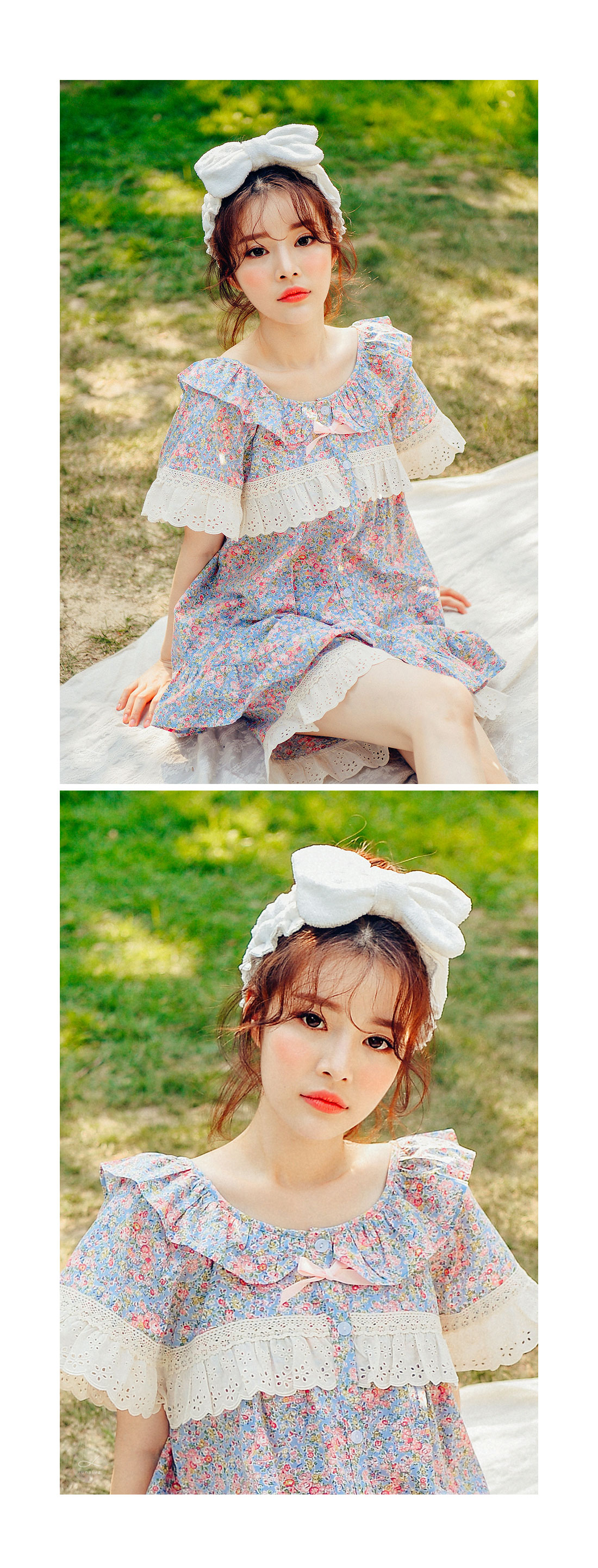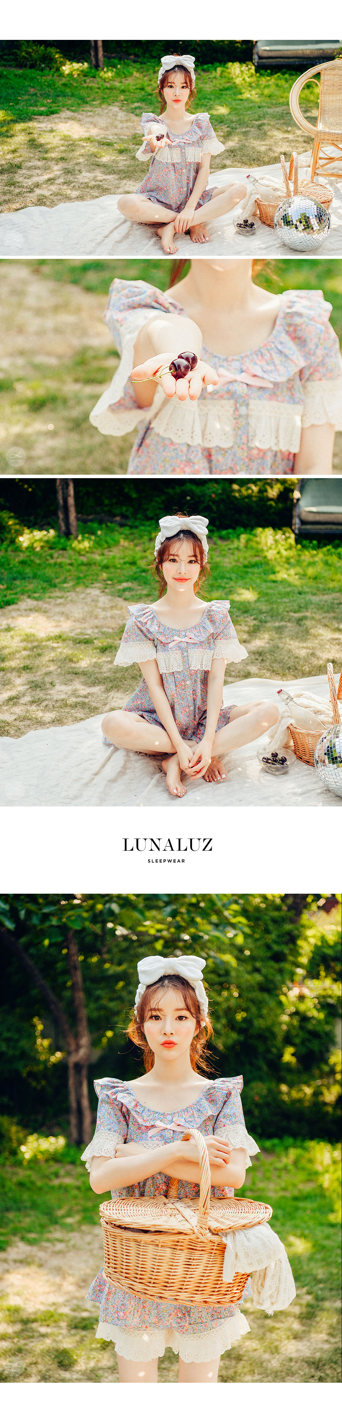 착용했을 때, 더 여성스러운 스타일의 잠옷입니다. 소프트한 컬러와 잔잔한 플라워 프린팅이 고급스러우면서 페미닌한 분위기를 내어줍니다. 재차 bt를 본 자체프린팅으로 소장가치가 높습니다. 소재는 60수 아사면으로 얇고 통기성이 우수합니다. 매끄럽고 은은한 광택이 돌며 피부에 닿는 느낌이 좋아 숙면을 취하시기 좋습니다. 로맨틱한 감성 잠옷으로 화사한 분위기가 감도는 스타일입니다. 강력추천 해드려요~! DETAIL 낙낙한 패턴으로 편안하게 착용하기 좋은 스타일의 룩인데요. 원단을 아끼지 않고, 요척을 많이 둬 착용감이 훨씬 좋습니다. 편안한 라운드 네크라인에 길고 풍성한 프릴을 봉제하고 소매의 끝단과 바스트 라인에 베이지 컬러의 각기 다른 면 레이스를 2중으로 봉제해 고급스럽게 디자인했습니다. 착용시 편안하고 예뻐 보이는 패턴으로 강력 추천 해드립니다. 전체 오픈형으로 탈착용이 편합니다. 팬츠는 3부 쇼츠 기장으로 동일하게 고가의 면레이스 장식을 봉제해 포인트를 주었습니다. 100%국내 제작으로 디자인, 소재, 봉제의 퀄리티가 높습니다. SIZE 여성 사이즈는 평균 44반~66반 size까지 커버 가능한 free사이즈 입니다.