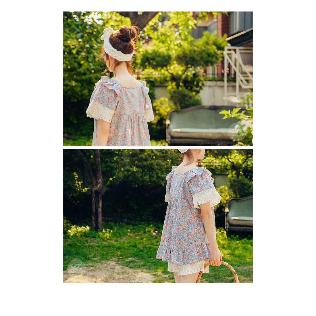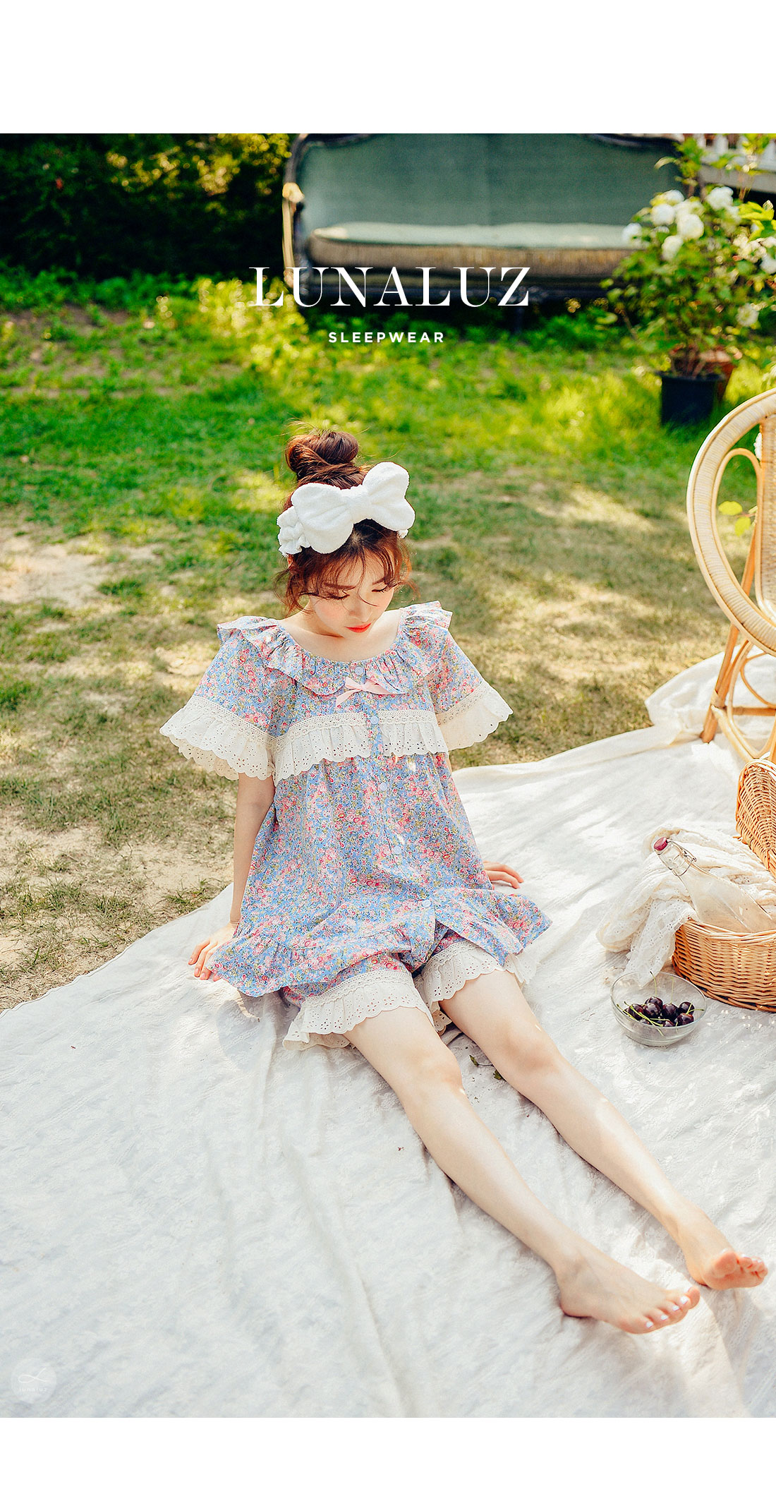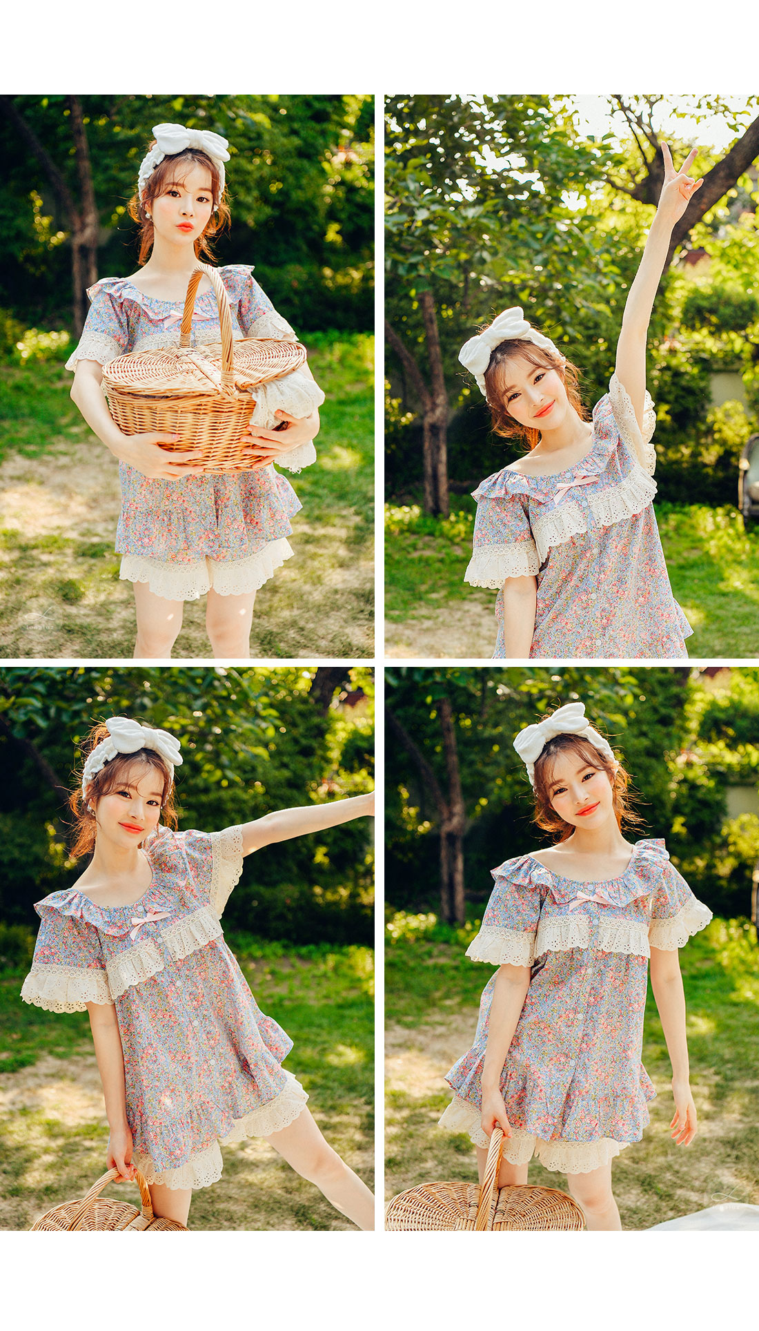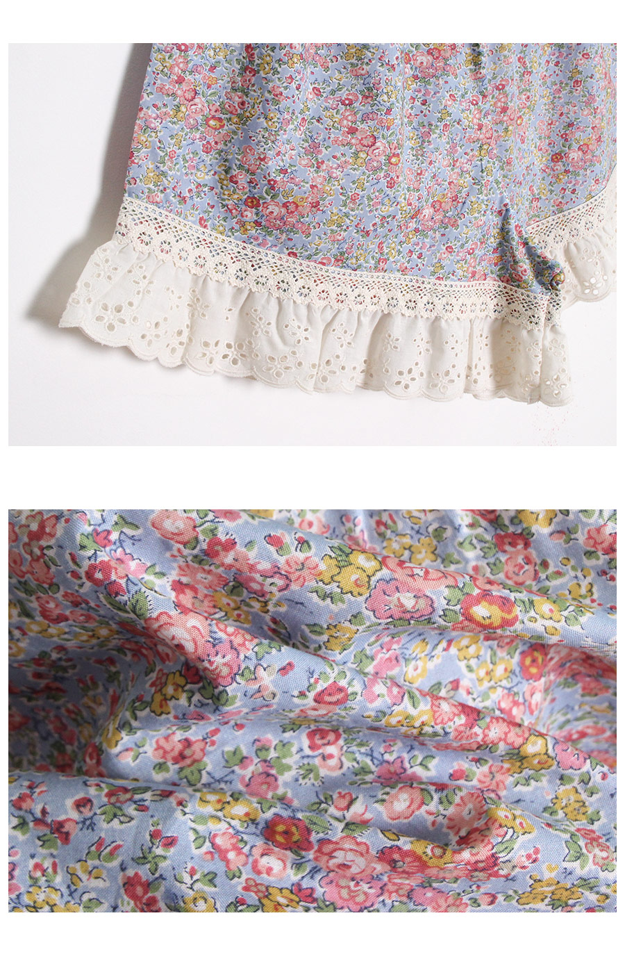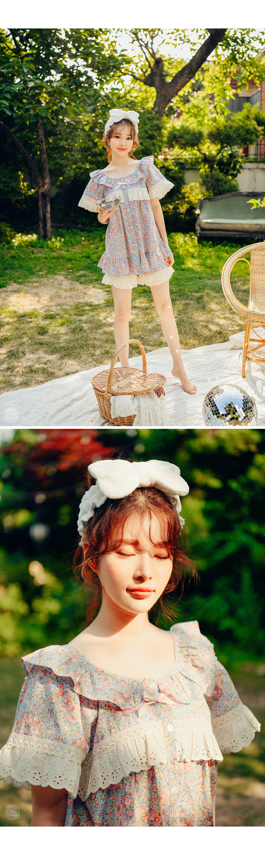 착용했을 때, 더 여성스러운 스타일의 잠옷입니다. 소프트한 컬러와 잔잔한 플라워 프린팅이 고급스러우면서 페미닌한 분위기를 내어줍니다. 재차 bt를 본 자체프린팅으로 소장가치가 높습니다. 소재는 60수 아사면으로 얇고 통기성이 우수합니다. 매끄럽고 은은한 광택이 돌며 피부에 닿는 느낌이 좋아 숙면을 취하시기 좋습니다. 로맨틱한 감성 잠옷으로 화사한 분위기가 감도는 스타일입니다. 강력추천 해드려요~! DETAIL 낙낙한 패턴으로 편안하게 착용하기 좋은 스타일의 룩인데요. 원단을 아끼지 않고, 요척을 많이 둬 착용감이 훨씬 좋습니다. 편안한 라운드 네크라인에 길고 풍성한 프릴을 봉제하고 소매의 끝단과 바스트 라인에 베이지 컬러의 각기 다른 면 레이스를 2중으로 봉제해 고급스럽게 디자인했습니다. 착용시 편안하고 예뻐 보이는 패턴으로 강력 추천 해드립니다. 전체 오픈형으로 탈착용이 편합니다. 팬츠는 3부 쇼츠 기장으로 동일하게 고가의 면레이스 장식을 봉제해 포인트를 주었습니다. 100%국내 제작으로 디자인, 소재, 봉제의 퀄리티가 높습니다. SIZE 여성 사이즈는 평균 44반~66반 size까지 커버 가능한 free사이즈 입니다.