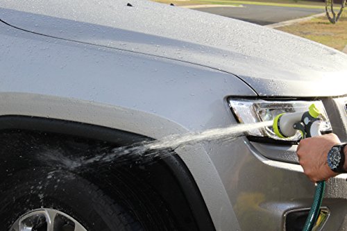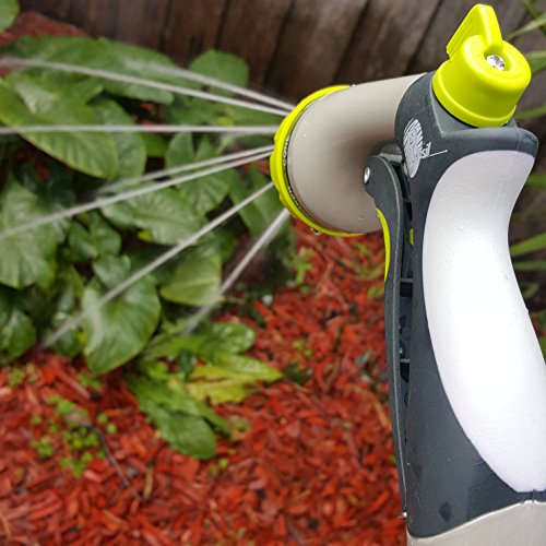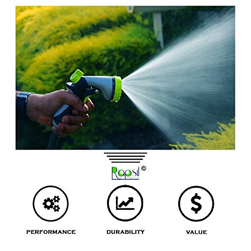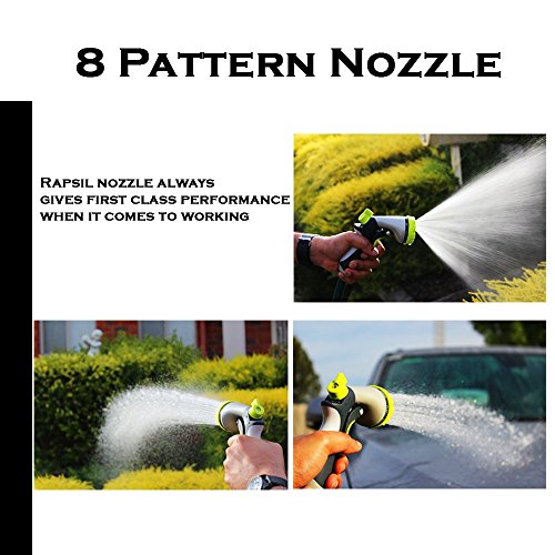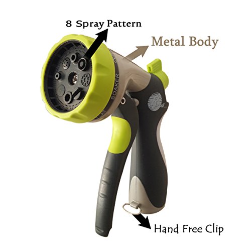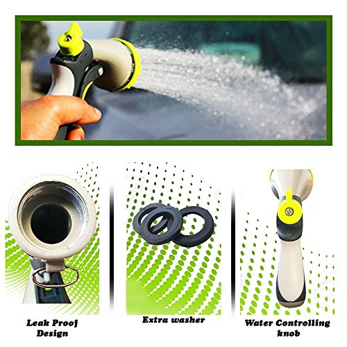 -. Feature : 8 PATTERN SPRAY HEAD - Cone, jet, centre, mist, shower, rinse, flat, and soaker.Changing the functions just takes a twist until it clicks into place. The handle is comfortable and slip resistant / PULL TRIGGER AND HANDS FREE CLIP -The pull trigger is a nice easy, natural motion. It doesn't stress the wrist when holding the nozzle on for a period of time.The hands free clip feature is great it gives you the ability to lock back instead of holding the trigger halfway, all while still controlling the stream and volume / THE METAL BODY CONSTRUCTION -The construction is solid. It has a heavy feel to the body of it, and the rubberised overlay grip gives a positive traction spot to your hand when extra rubber washer prevent leakage,easy to install to your garden hose / WATER ADJUSTER -The adjustable water flow valve on the back of the handle would help those who might be concerned about well water volume, city ordinances, or other water conservation concerns.Our Garden Nozzle is Backed up by 100% Money Back Guarantee / USAGE -Can use it for just about everything... watering plants and flowers, cleaning the walkway/driveway, watering the grass, even can use it to give a bath to dog, which also saves you 90% water wastage.It has a powerful jet setting for spraying things at a distance such as wasp nest that you wouldn't want to get close to