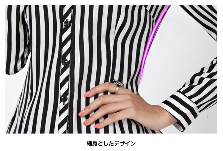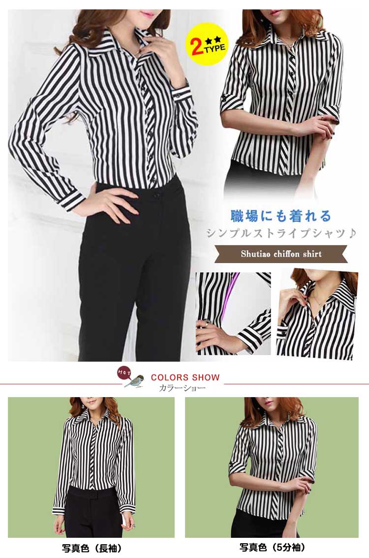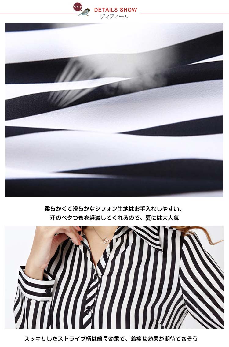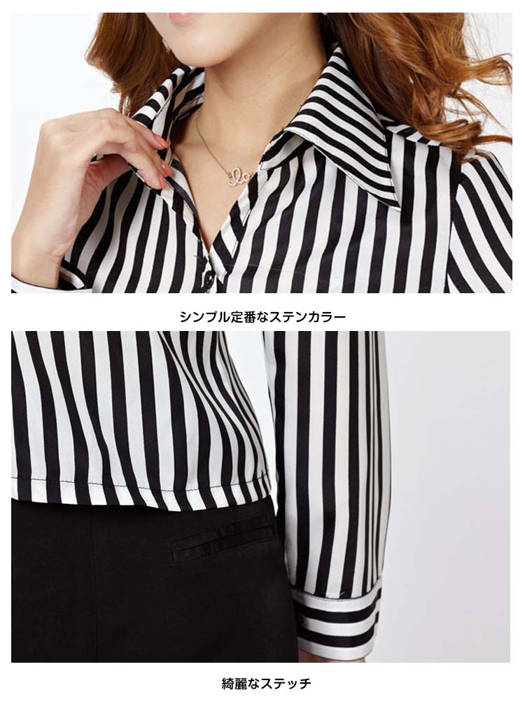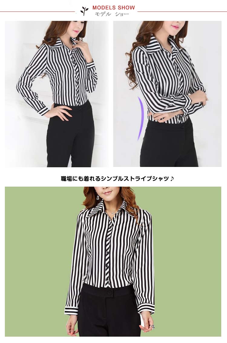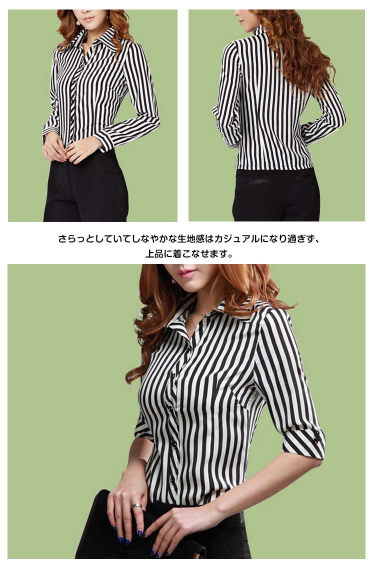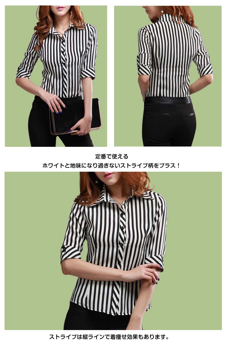 | 職場にも着れるシンプルストライプシャツ♪さらっとしていてしなやかな生地感はカジュアルになり過ぎず、上品に着こなせます。定番で使えるホワイトと地味になり過ぎないストライプ柄をプラス!ストライプは縦ラインで着痩せ効果もあります。 | |