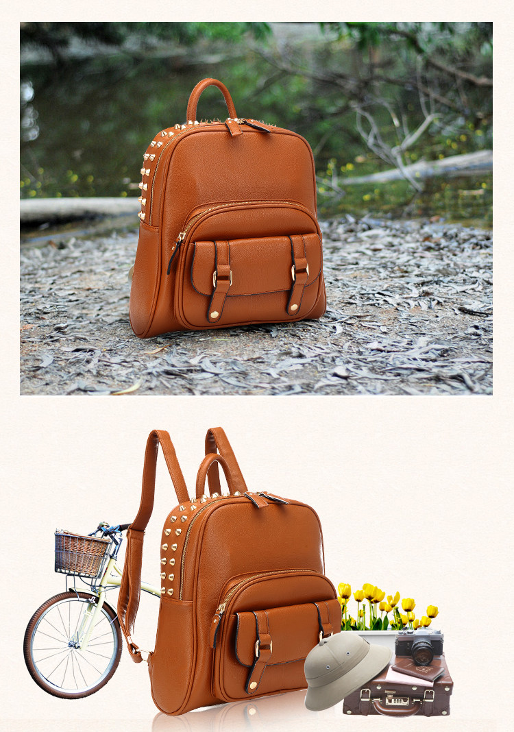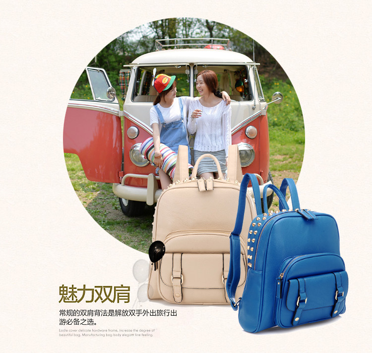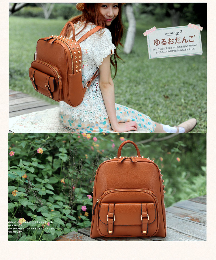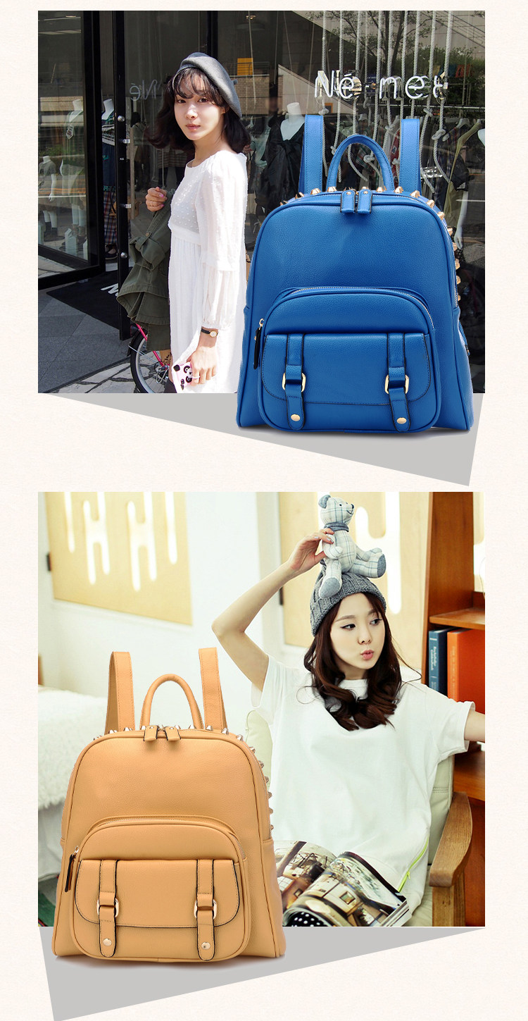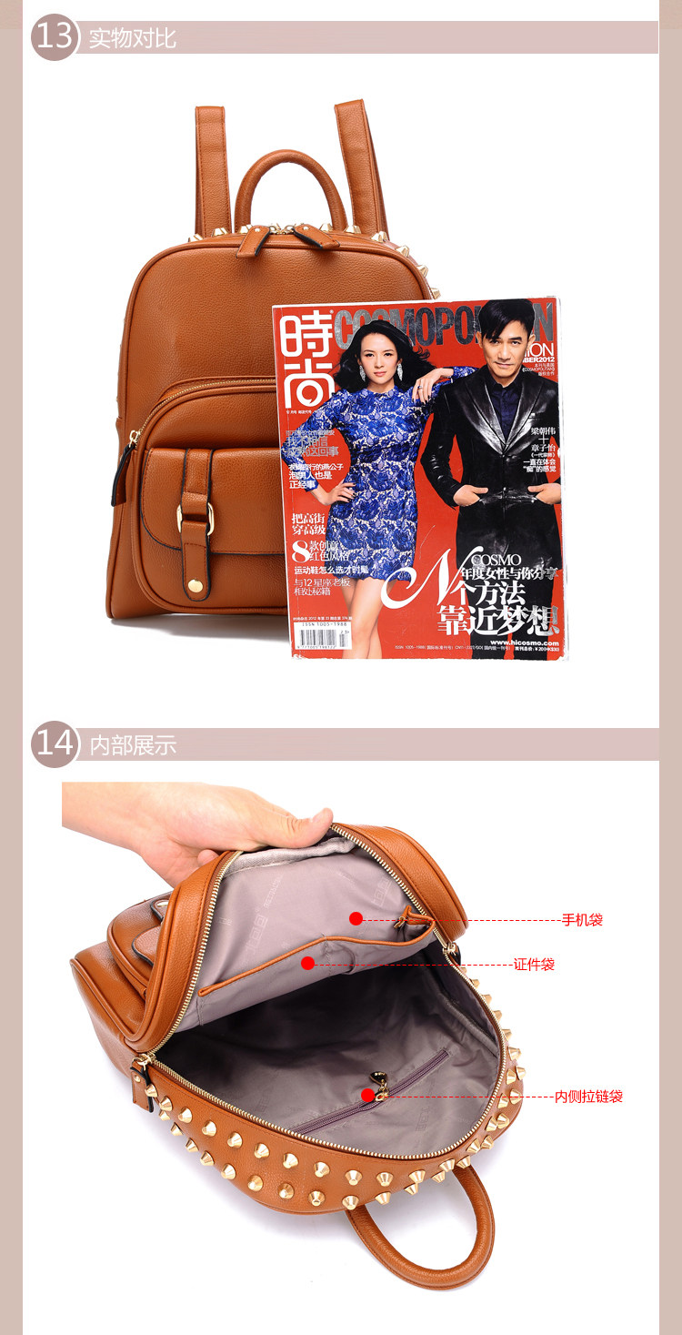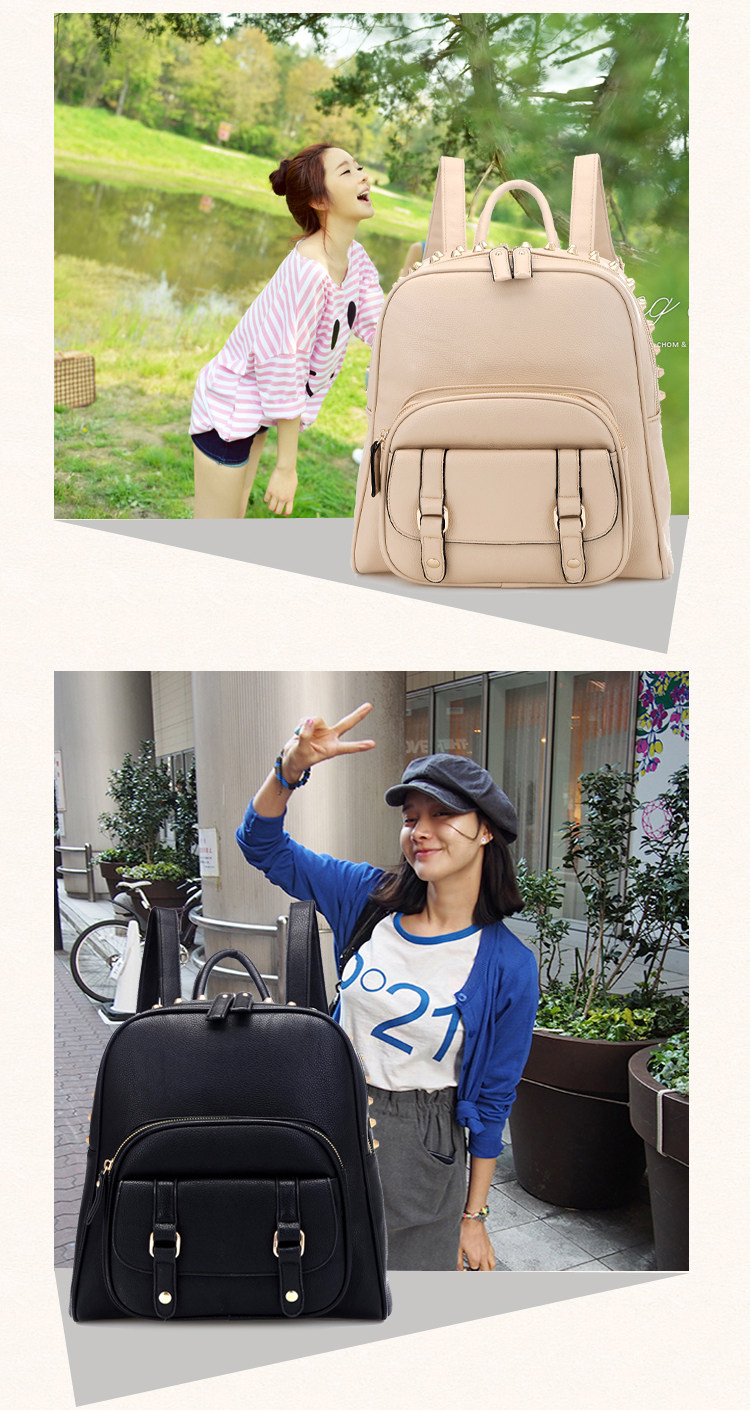 韩版铆钉潮书包复古学院风派休闲。内部1个拉链袋,2个置物袋
