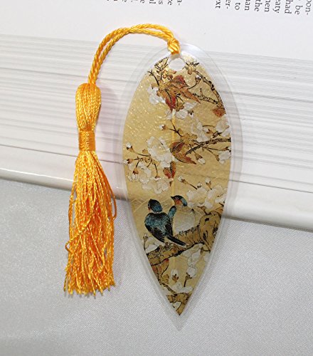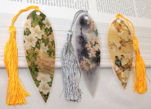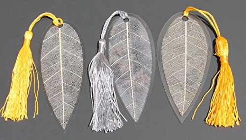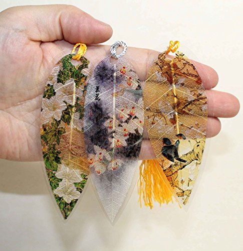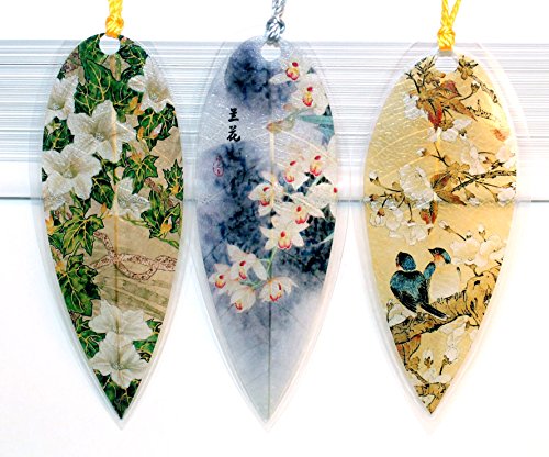 Lucore Leaf Bookmarks - Asian White Flowers Painting Lucky Charm, Ornament, Hanging & Wall Decor, Art Decoration - 3 Pcs, Made of Real Leaves