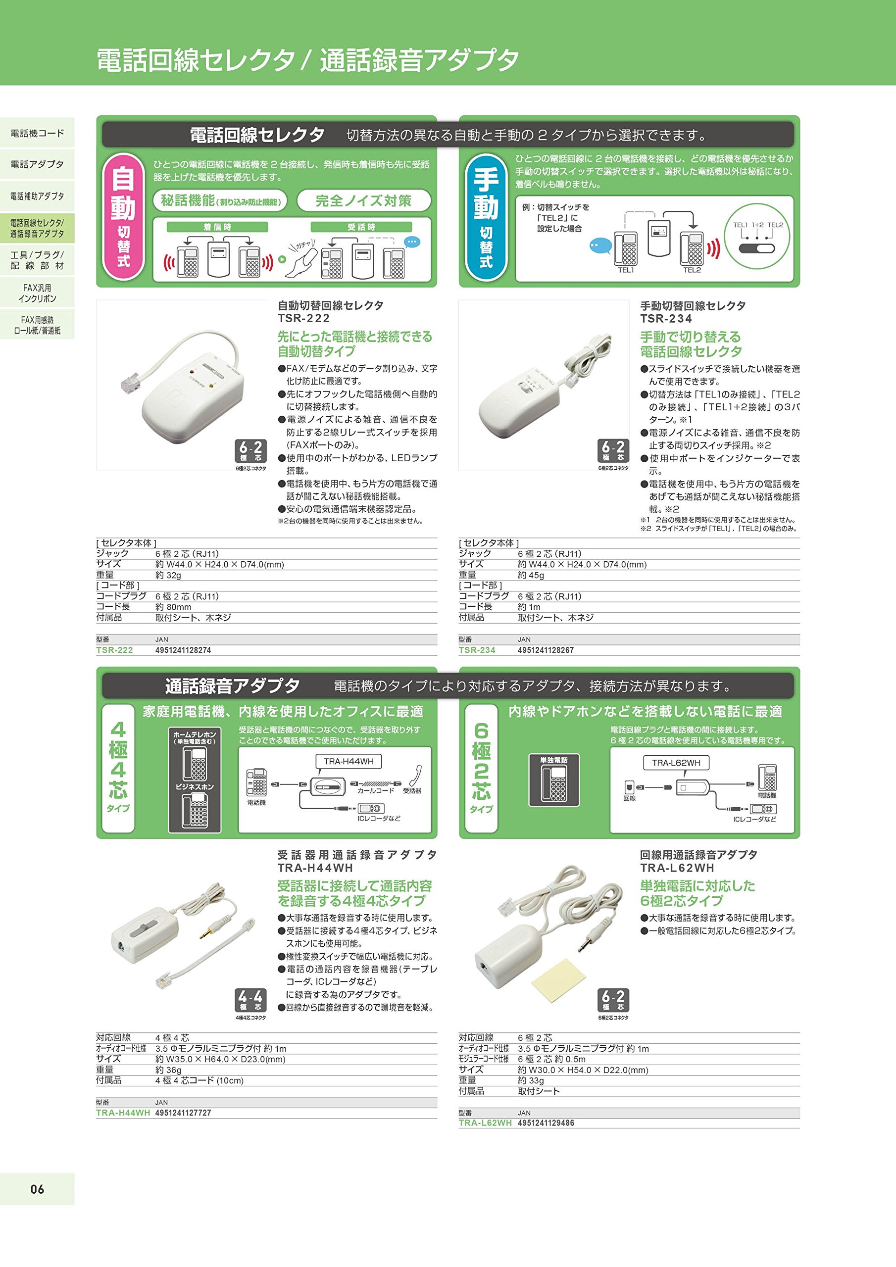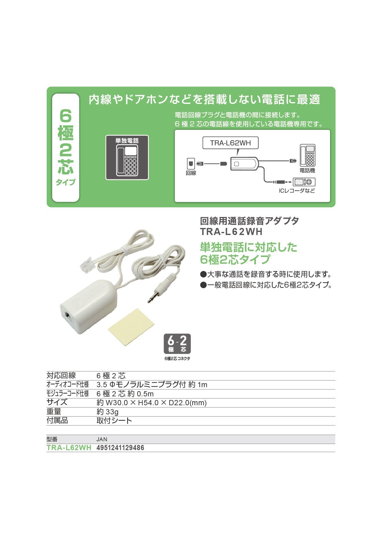 Miyoshi MCO for phone line call recording adapter 6-pole 2 core tra-l62wh