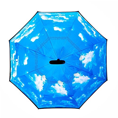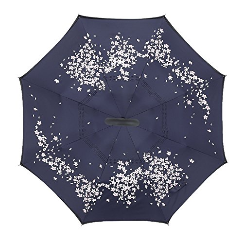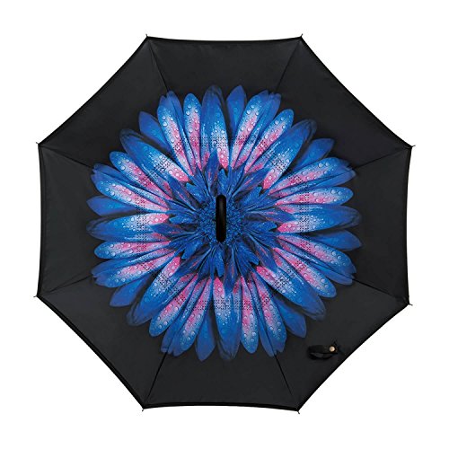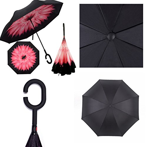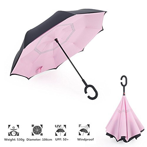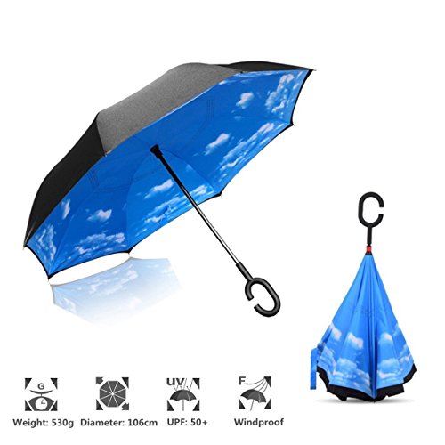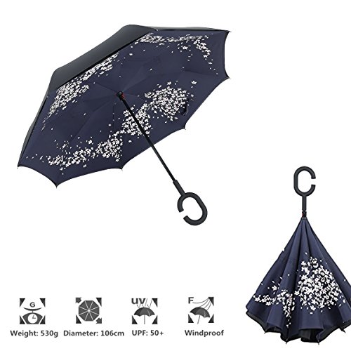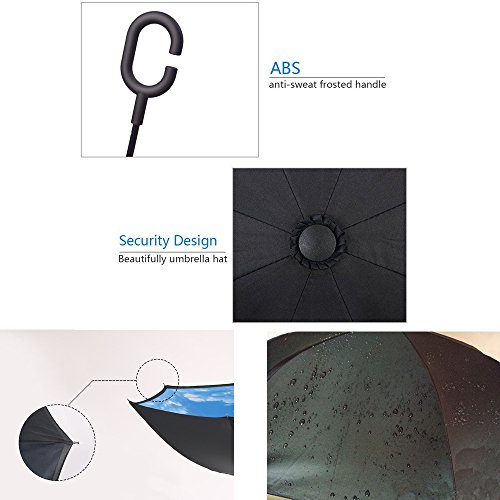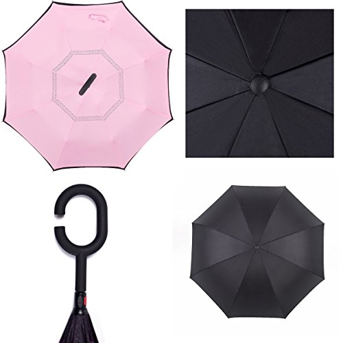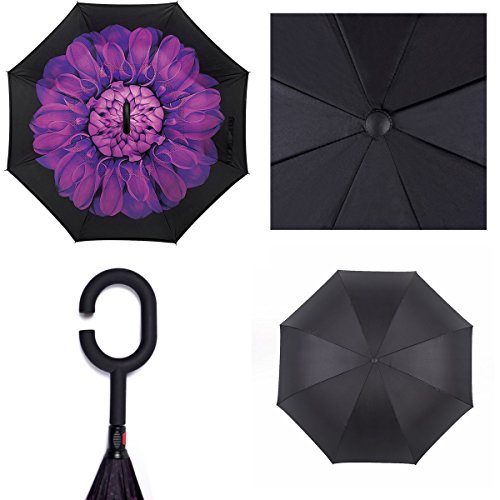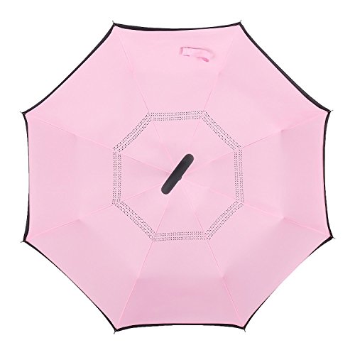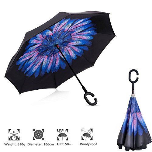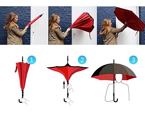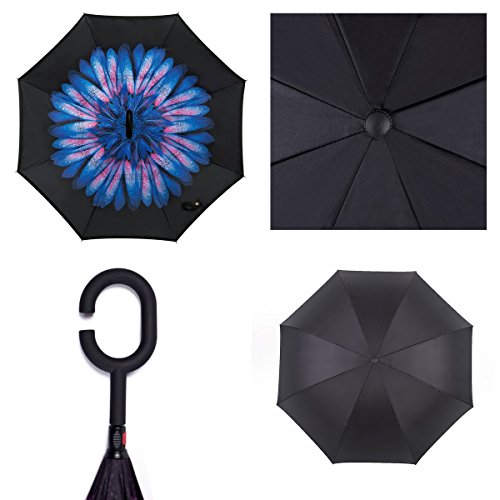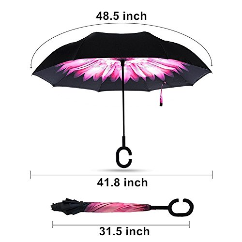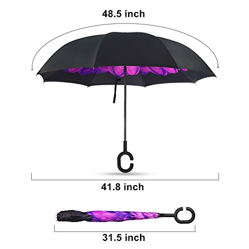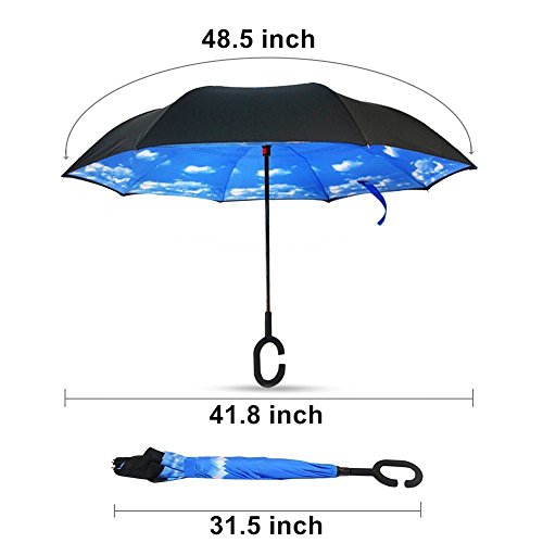 ● Double layer Inverted umbrella Unique design double layer inside out umbrella, make it easy for you on raining day, won't wet your car, documents or others. Advanced double layer ribs made the inverted umbrella more sturdy. Measures 31.5" long and 41.8" in diameter when open. It's large enough to shelter both you and your loved one from the downpour