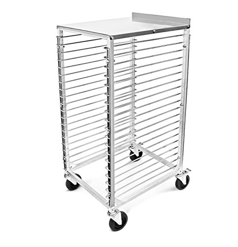 -. Feature : Commercial heavy duty aluminum frame construction with 2 locking casters / 16 gauge heavy duty s/s top, 0.25 Inch diameter super heavy wire hold pans tightly / Overall size(l x w xH): 25 x 21 x 49 inch, top size( l x w): 25 x 21 inch, 1.4" High backsplash / Holds 20 full size pans or 40 half size pans, 1.75 Inch net space between each tier / Swivels help with easy moving