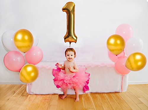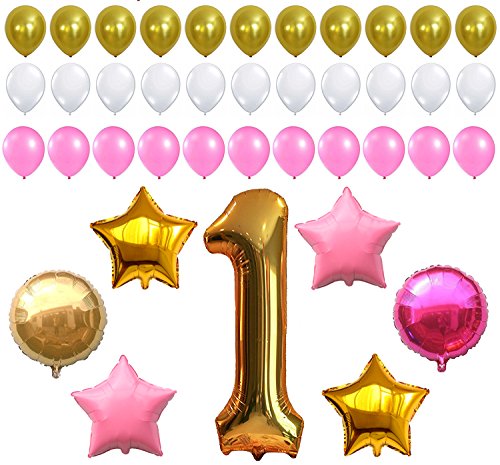 FIRST BIRTHDAY DECORATION - Pink White Gold Balloons Kit, Perfect for 1st Bday Party Supplies, Girl or Boy, Number One 1, Latex Stars and Round Ballon