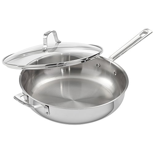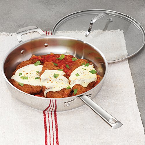 In my Emeril Lagasse Stainless Steel Cookware you have the beauty of stainless steel with the added bonus of an aluminum base bottom, which means that the cooking surface heats up quickly. These pots and pans are also ready to go from either conventional or induction stovetops straight to the oven and then for quick clean up, they are dishwasher-safe. Tempered glass lids make it easy to monitor cooking without lifting the lid and losing precious steam. Perhaps my favorite feature about this set, however, is the pour spouts and straining lids which work together to allow draining of cooking liquids without removing the lids. This Emeril Lagasse Stainless Steel 5 Quart Covered Deep Sauté Pan is generously sized and is perfect for braising, stewing, or cooking one-pot meals for a crowd.Feature