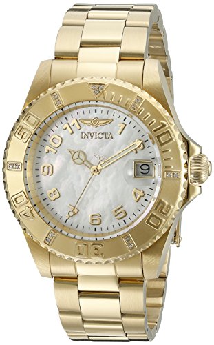 Studio : Invicta Publisher : Invicta Binding : Watch Product Description Simple with a touch of elegance this Pro Diver timepiece from Invicta belongs in every woman's collection. An all 18K gold plated stainless steel design is paired with a beautiful mother of pearl dial and 15 white diamond bezel accents put the final touch on this magnificent piece that is suited for any occasion. 0