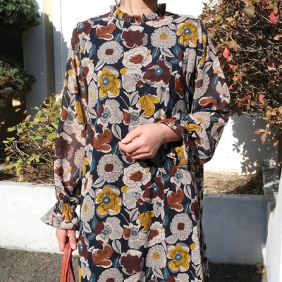 화려한 플라워패턴이 돋보이는 쉬폰 롱 원피스에요. 날씨가 추워져도 쉬폰원단은 포기할수 없는거 같아요.