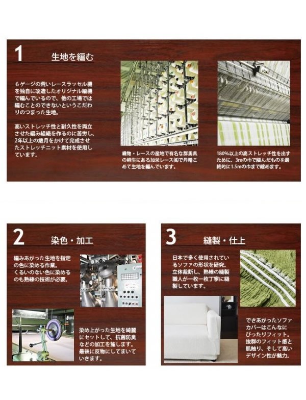縦横自在に伸びて、ソファにぴったりフィットするソファカバー。ストレッチ性を極限まで高めたスーパーストレッチニット生地を使用。女性一人でも簡単に着脱ができる手軽さも魅力です。SEKマーク取得の抗菌防臭加工も施し、いつでも快適に愛用できます。ベーシックなカラーリングと挿し色を含めた6色展開。お部屋のイメージに合ったカラーをお選びください。日本製。 |