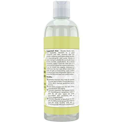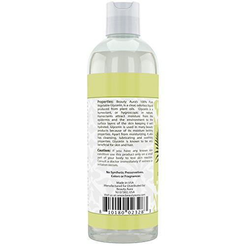 -. Feature : VERSATILE USES Beauty Aura's 100% Pure Vegetable Glycerin, is produced from plant oils. It is an organic compound composed of carbon, oxygen and hydrogen. It's a thick (viscous), colorless and odorless liquid which make it very easy to use on the skin as a glycerin moisturizer or as a vegetable glycerin oil for the hair or in any DIY products. / 100% NATURAL Our pure glycerin is made only from plant-based ingredients, not from animal byproducts or from synthetic chemicals, making it the ideal choice for green glycerin skin and hair care treatments / HEALTHY SKIN AND HAIR BENEFITS Vegetable Glycerin may help to hydrate the outer layer of skin. It may also help to restore skin's normal protective barrier function. It also draws oxygen into the skin.Vegetable Glycerin is beneficial for hair care. Its antibacterial properties helps to keep the scalp healthy and aids in preventing scalp infections and dandruff. / COMPLETELY PURE We never mix additives or dilution or preservatives or any kind of liquids in our glycerin, making it the purest, most potent liquid glycerin on the market / QUALITY ASSURED Our vegetable glycerin is produced locally in the U.S., so that we can carefully control its quality and assure your satisfaction