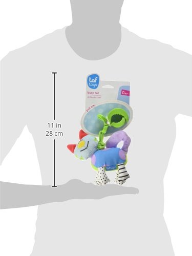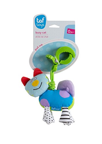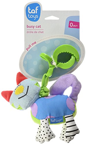 The soft rattling Busy Cat Clip-on Stroller Toy from Taf Toys attaches with a large size plastic clip to a stroller, crib, bag, and more for on-the-go fun. This colorful kitty with a smiley blue face and polka-dotted legs makes the purr-fect play pal and travel companion while also building baby's fine motor skills.Feature