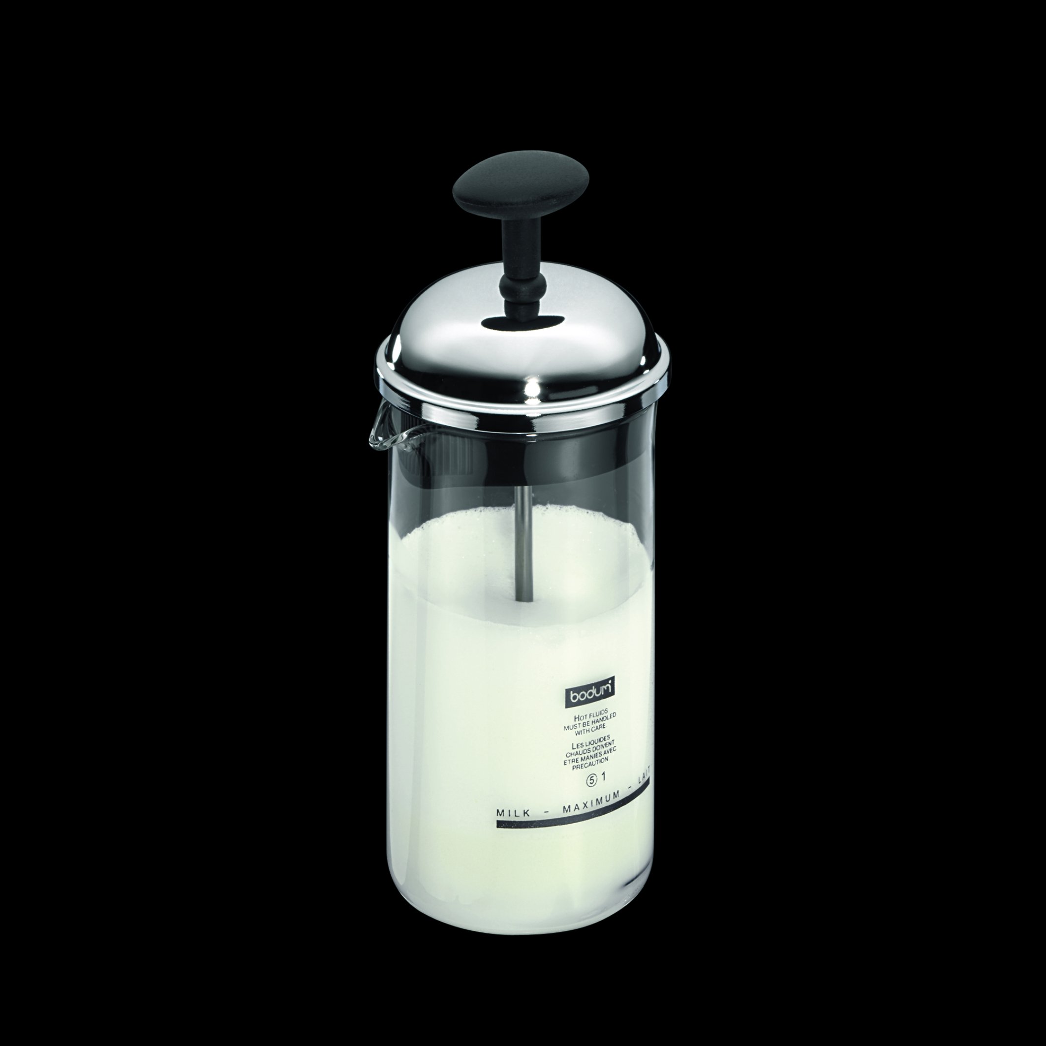 Put the heated milk (ingredient not adjusted) into the container, move the plunger up and down tens of times, remove the lid and wait a few seconds.