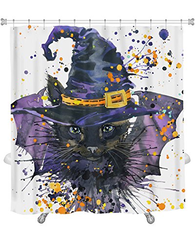 -. Title : Gear New Halloween Cat & Witch Hat Watercolor Illustration Shower Curtain, 74" X 71"