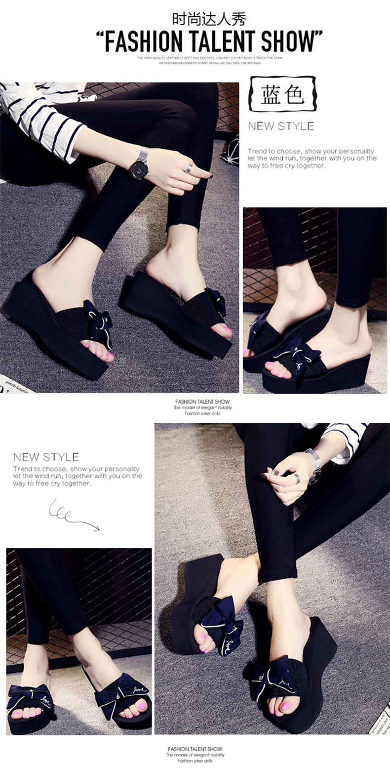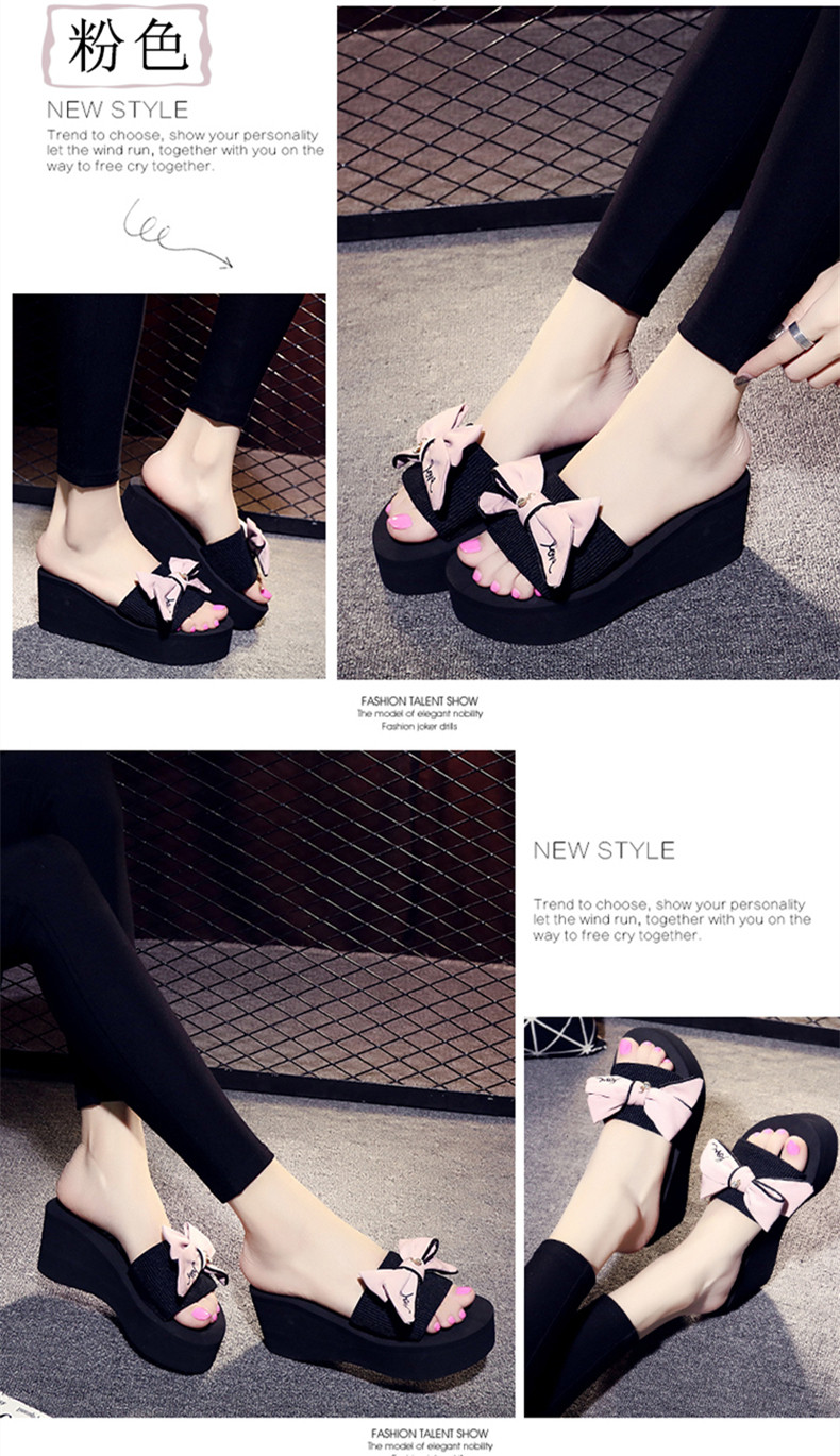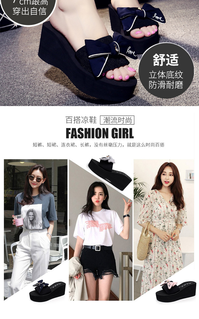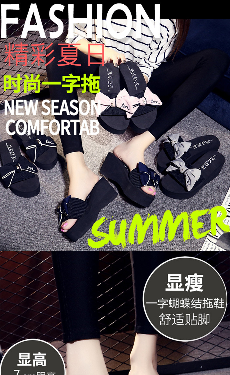 拖鞋女夏厚底蝴蝶结一字拖鞋韩版高跟时尚休闲沙滩鞋外穿坡跟凉拖