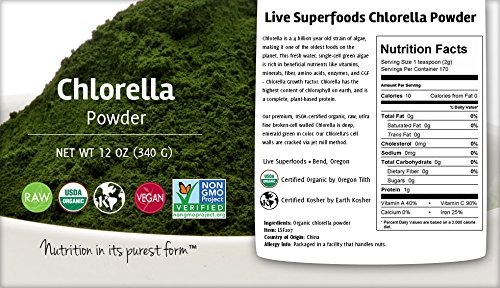 Studio : Live Superfoods Publisher : Live Superfoods Binding : Health and Beauty Product Description Live Superfoods Organic Chlorella Powder, 12 oz Chlorella (chlorella vulgaris) is a single-celled freshwater alga, containing large amount of chlorophyll, the chemical that gives plants their green color. Chlorophyll is an essential compound for photosynthesis, the process by which plants convert light into chemical energy. Chlorophyll is also available in green leafy vegetables. Live Superfoods Chlorella Powder is a premium, USDA-certified organic, raw, ultrafine broken-cell walled chlorella that is deep, deep green in color. Our chlorella's cell walls are cracked via jet mill method. Chlorella contains vitamin C and carotenoids, both of which are antioxidants. Antioxidants are compounds that block the action of free radicals, activated oxygen molecules that can damage cells.? Chlorella is a potent source of vitamin B-12, a vitamin most commonly found in proteins. It also contains vitamins B-1, B-2, B-6, and Folic acid, and additional B-complex vitamins.?The minerals that naturally occur in chlorella include magnesium, potassium, iron, and calcium.? Chlorella is a rich source of 19 naturally occuring amino acids, including all eight essential amino acids.? Chlorella is considered by some to be a natural "multivitamin", possessing at least 20 beneficial nutrients. Chlorella is also used by those who eat a vegan or vegetarian diet as a source of amino acids (protein) and vitamins that are often found only in proteins (such as B-12).? Beneficial Nutrients in Chlorella Vitamin B1 - Needed for nervous system, heart, and muscle function Vitamin B2 - Needed for growth, reproduction, and to metabolize carbs, fats, and proteins Vitamin B6 - Strengthens the immune system, needed to synthesize protein and fat Vitamin B12 - Forms and regenerates red blood cells, 0