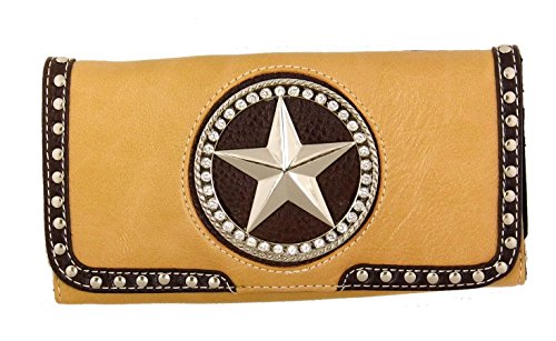 Binding : Apparel Product Description Bifold Metal Frame Wallet Belt Buckle Decoration with a Brown Trim on Front with Soft Decorated with Rhinestones Easy Push Button Open Credit Card or Business Card Slots Pic ID Windows Checkbook Cover Included Back, Magnetic Closure Pocket Note: Cow print Pattern/Picture may differ from the one pictured. 0