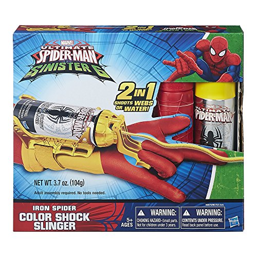 -. Feature : Shoots water or Spidey Shot Web Fluid / Imagine web-slinging Spidey battles / Glove is one size fits most and features Iron Spider design / Includes Color Shock Slinger, Spidey Shot Web Fluid, refillable water cartridge, and glove.