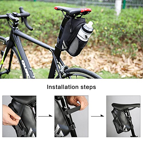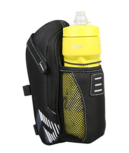 1. Size: 9.44*3.74*4.72inch/24*9.5*12cm(L * H * W) 2. Weight: 160g 3. Capacity: 1.6L 4. Material: 900D Polyester 5. Color: Black 6. Type: Saddle/Seat bag 7. Installation: Strip with buckle, velcro strips 8. Fits for water bottle diameter: ≤ 750mm Package includes: