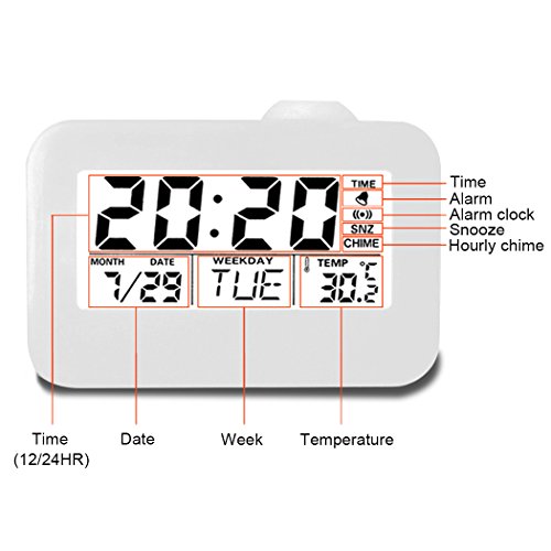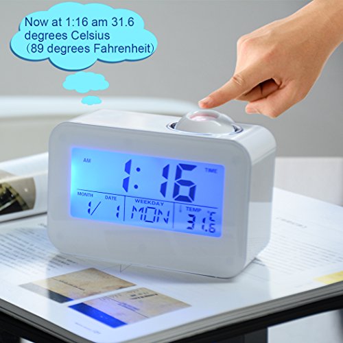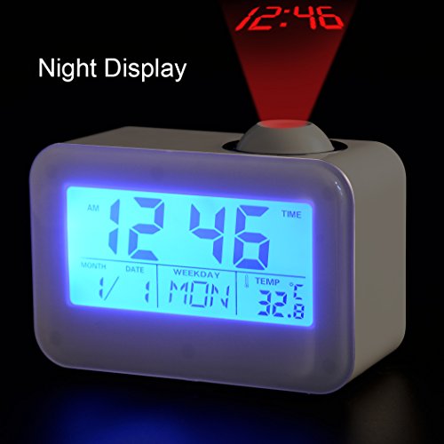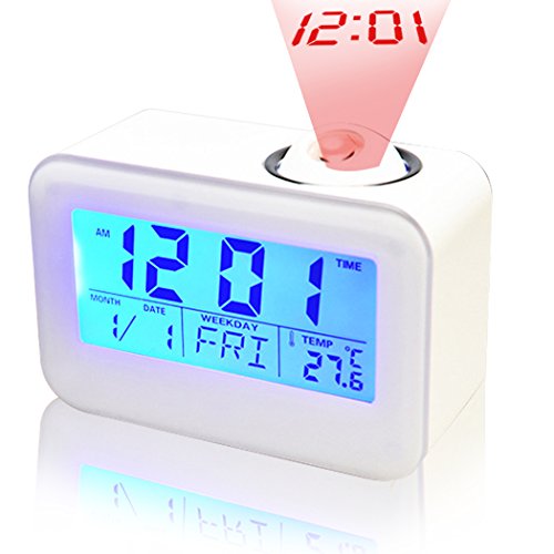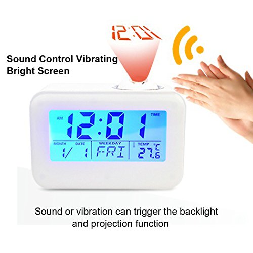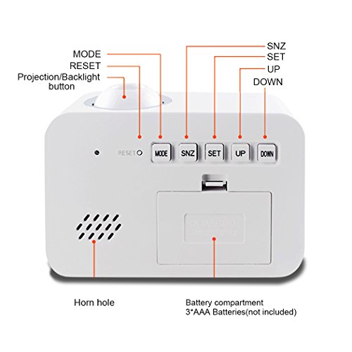 Studio : Hang Rui Technology Publisher : Hang Rui Technology Binding : Kitchen Product Description The alarm clock display normally, when the sound vibration decibels greater than 60 dB, it will wake up the LCD display and the LED backlight lights the projecton at the same time, and the display will automatically shut down after 5 seconds,you can touch the clock or make a sound,the backlight and projection will work again. You can press the projection lamp or "SNZ" button with the voice broadcast function, it is a stylish and convenient personality design. The alarm clock has a hourly chime at the hours, so you can easily know what the time is now. Features: 1. Time projection function 2. Voice broadcast 3. Backlight (luminous) 4. Calendar function 5. Digital thermometer 6. Alarm clock / snooze function (4 music options) 7. Hourly chime function 8. Sound control vibrating bright screen function Specification: Product color: ceramic white Material: high quality ABS electronic components Screen display: calendar clock, date, week, temperature Power supply: 3*AAA (carbon) batteries Packaging contains: 1 × clock, instructions (English and German) Product size: 12.4 * 8.7 * 5.4cm Packing size: 13 * 95 * 62cm Suitable places: study, work office, home leisure and so on Adapt to the crowd: suitable for office workers, students, home elderly, with the mother's mother and so on Note: 1. This alarm clock can not use the high-energy alkaline batteries, it is recommended to use the carbon batteries. 2. When the screen is facing ourselves, the projection time is correct, if the screen is back to ourselves, the projection time will be inverted. 3. There may be errors compared with the professional thermometer, the temperature is only for reference .