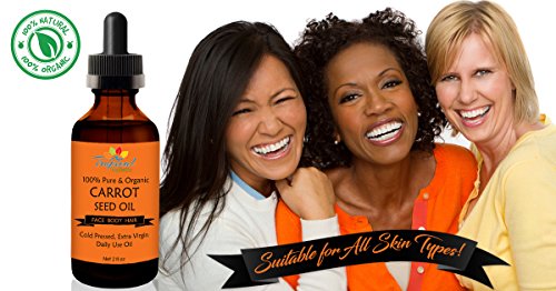 ENJOY LOVELY, BEAUTIFUL HAIR, NAILS, SKIN with this 100% Pure Unrefined Extra Virgin Carrot Seed Oil. It's been Cold Pressed for maximum freshness and concentrated natural benefits. This powerful herbal nutrient is very rich in antioxidants and beta carotene. This helps new cells generate more quickly. You are better able to grow new hair, healthier hair, and achieve a younger look. Works similarly for face and skin supporting a healthier, fresher, younger look.RELIEVES STRESS AND ANXIETY when used in aromatherapy. You'll love the mild earthy aroma that sends a wave of relaxation and good feeling throughout your home. Massage a few drop each night onto problem areas to tighten wrinkles, fade fine lines, and grow new cells in areas that have been damaged from sun, wind, or lack of proper moisture.
