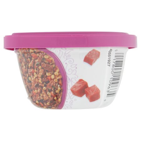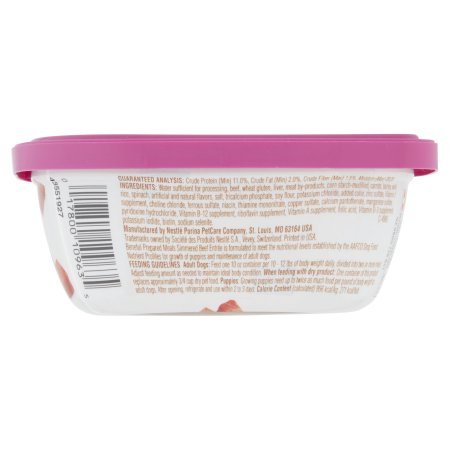 Product Description See a smile after every bite with this meal of meaty chunks, wholesome grains and veggies. Your dog will love sinking his teeth into this prepared blend, and you'll love being able to reseal the tub. If there are any leftovers, that is. 0