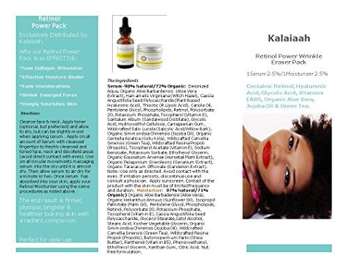 Kalaiaah ORGANIC & natural Retinol Skin Care Set: Cream & Serum 2.5% Wrinkle Eraser, Skin Smoothing & Collagen Boost Power Pack is Skincare AWESOMENESS MADE in the USA in QUALITY CONTROLLED lab with ENVIRONMENTAL FRIENDLY packaging & "old world" customer service. We are a HIGH-END SKINCARE brand with laser focus on QUALITY & FAIR PRICES.