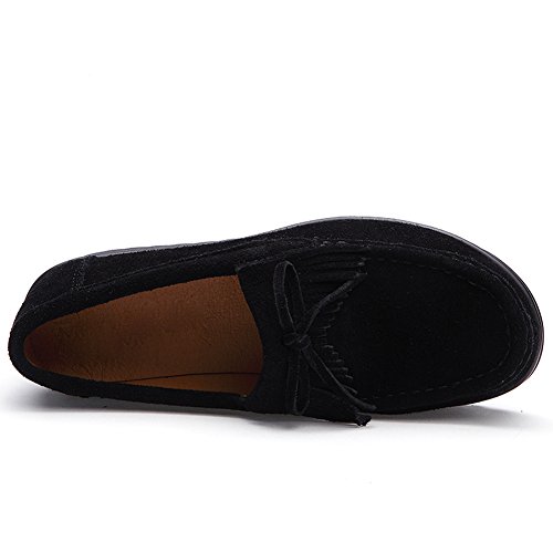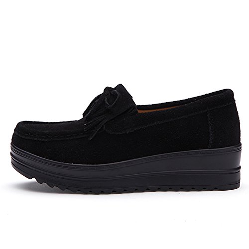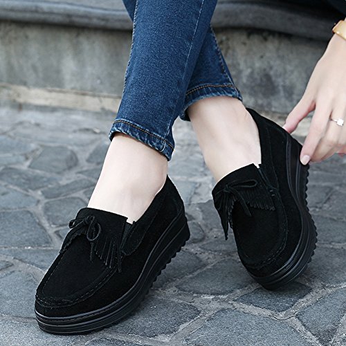 Binding : Apparel Product Description HKR Ladies Moccasins Round Toe Slip On Platform Sneakers Suede Driving Loafers The HKR was designed to be a stylish, comfortable, fashion platform wedge shoes that can be worn all day long. Inspired in design by the ever present platform style, you can rest assured that this tried and true look of this platform loafers will wear great in almost any situation. Even better, with 7 color options available,you can always find a style that will look just right, even with those hard to match outfits. 1. These platform loafers features suede upper,slip on round moc toe,exquisited hand-stitching,cute tassle and bowtie decoration,low top,soft and breathable lining,mid heel height with platform,anti-slip pu sole provides great traction and grip. 2. The slip on platform tassel loafers are the perfect shoes for all season.They look adorable with jeans,jacket,shorts,skirts, skirt or leggings,any casual or fashion look. 3. If you are short and almost all of pants are too long for you, and you hate wearing heels shoes and want to look professional without killing your feet,don¡?t hesitate to get these comfort wide width shoes as an alternative to wearing heels to work. They are extremely comfortable, very well made,and go with virtually every outfit Size Charts: US Size 5.5 B (M) US = Heel to Toe 8 7/8 inch(22.5cm) = China Size 35 US Size 6 B(M) US = Heel to Toe 9 inch(23cm) = China Size 36 US Size 6.5 B (M) US = Heel to Toe 9 1/4 inch(23.5cm) = China Size 37 US Size 7 B (M) US = Heel to Toe 9 1/2 inch(24cm) = China Size 38 US Size 7.5 B(M) US = Heel to Toe 9 5/8 inch(24.5cm) = China Size 39 US Size 8 B (M) US = Heel to Toe 9 7/8 inch(25cm) = China Size 40 0