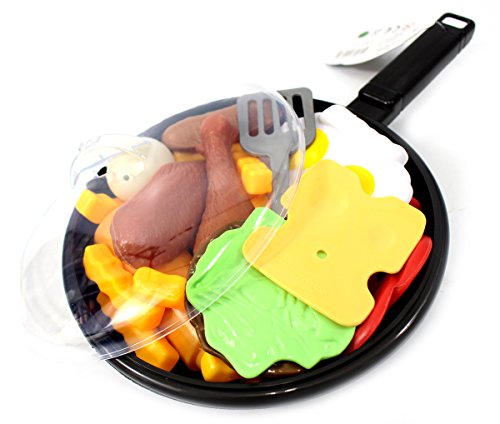 -. Feature : 25 piece Play Food and Cooking Pan Playset / Features 7.5" Diameter Cooking Pan with Lid and Spatula / Make a Cheeseburger with Bun, Cheese, Beef Patty, Lettuce and Tomato / Other Food items include Hotdog, Chicken Wing & Drum, 8 Fries and Eggs / Includes Ketchup and Mustard Bottles