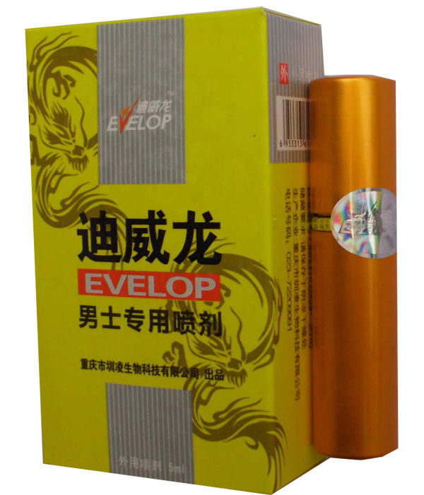 迪威龙喷剂系根据中国传统医学理论,采用现代生物制药技术和天然名贵中草药最新配方精制加工而成的外用男士房事、卫生保洁制剂,具有较强抑菌消毒作用,可有效防止性疾病的传播和感染,同时可以克服男士早泄、延长房事时间。研究证明,该产品能显著改善局部血液循环,促进男士生殖器海绵体修复和血液贯注,进而达到使男士生殖的二次发育和成长,是难得的男士房事卫生保洁、克服早泄、提高生活质量的保健佳品。