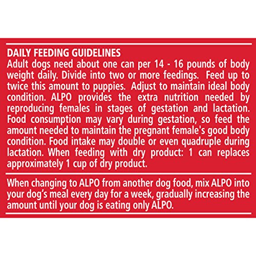 DirectionsWhen changing to ALPO from another dog food, mix ALPO into his meal every day for a week, gradually increasing the amount until he is eating only ALPO. Daily Feeding Guidelines: Adult dogs need about one can per 13 -15 pounds of body weight daily. Divide into two or more feedings. Feed up to twice this amount to puppies. Adjust to maintain ideal body condition. ALPO provides the extra nutrition needed by reproducing females in stages of gestation and lactation. Food consumption may vary during gestation, so feed the amount needed to maintain the pregnant female's good body condition. Food intake may double or even quadruple during lactation. When feeding with dry product: 1 can replaces approximately 1 cup of dry product. Store in a cool, dry place. Do not freeze.
