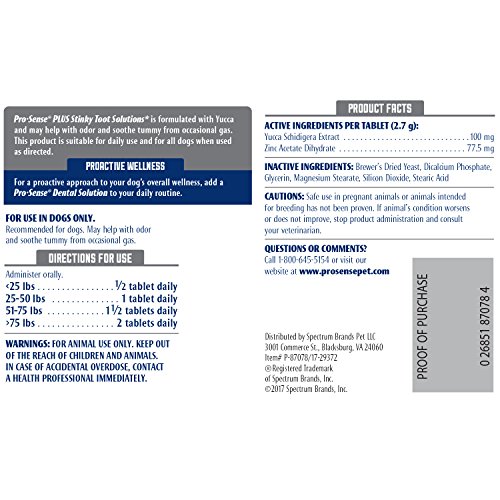Pro-Sense brand offers a variety of proactive, sensible solutions for all of your pet’s healthcare and wellness needs. We know pet parenting can be Tough, which is why we’ve improved our ingredients and benefits to make it easier than ever to care for them like any other member of your family. Uncomfortable and stinky gas can be a problem for your pup and your family. Pro-Sense plus stinky toot solutions tablets are formulated with yucca and may help with odor and soothe tummy from occasional gas. This product is suitable for daily use and for all dogs when used as directed. For a proactive approach to your dog’s overall wellness, add another Pro-Sense solution to your daily routine. For use in dogs only. Recommended for dogs. May help with odor and soothe tummy from occasional gas. Pack comes with 60 tablets. Simply administer the tablets oral fl based on recommended amounts.Feature