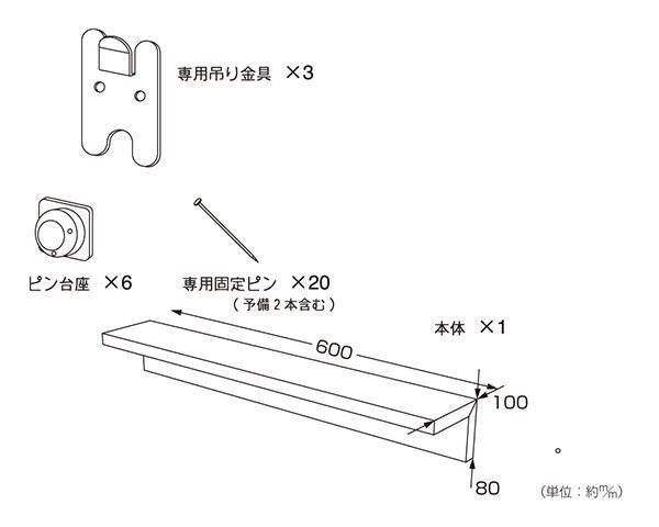 付属品専用吊り金具×3、ピン台座×6、専用固定ピン×20(予備2本含む)