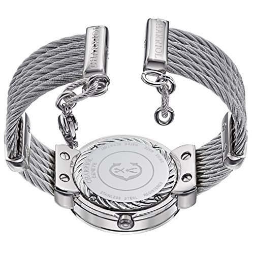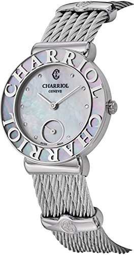 -. Feature : Polished stainless steel case and bracelet (chevron cable), Stainless steel caseback (screw-in), MOP bezel, with "Charriol" logo / Mother of pearl dial, Silvertone hands and dots, Small seconds at the 6 o'clock positon / Sapphire crystal, Swiss quartz movement, Push/pull crown and a Jewelry clasp / Case measurements: 30 mm in diameter x 7 mm thick, Strap measurements: 15 mm wide x 7 inches long / Water resistant to 99 feet (3 ATM/30 meters)