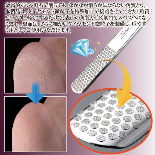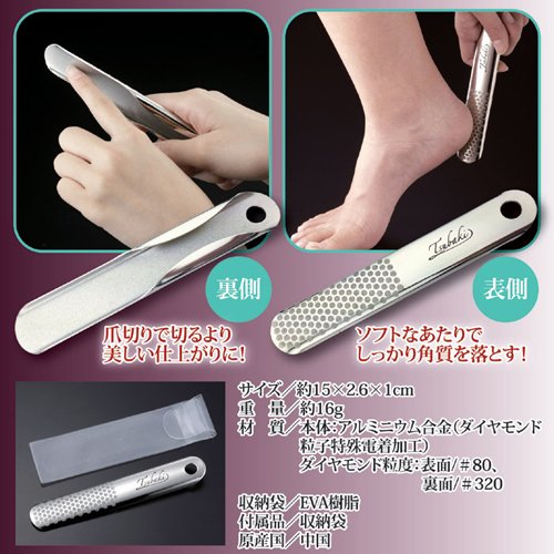 깎는 것이 지나치지 않기 때문에 피부에 상냥하다.뒷면은 세세한 다이아몬드 입자에 네일 케어에 최적.금속 줄이나 경석에 깎아도좀처럼(꽤) 매끄럽게 되지 않는 각질 잡아.본 제품은,다이아몬드 미립자를 특수 가공으로 접착시켜 나와 왔다「각질 잡아」입니다.가볍게 문지르는 것만으로,표면의 각질이 희게 깎을 수 있어 매끈매끈 입니다.고, 뒷면은,한층 더 세세한 다이아몬드 미립자를 장비 하고, 조줄용으로서 사용 하실 수 있습니다.