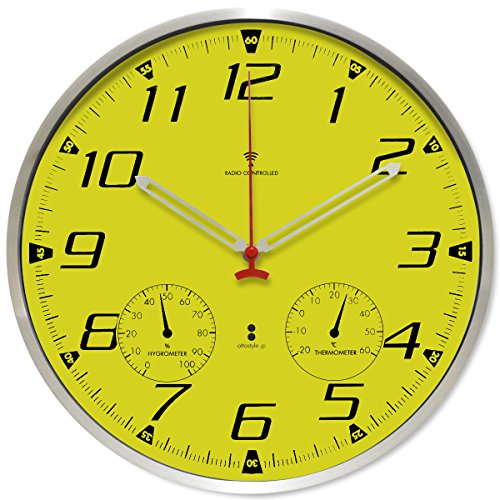 -. Title : ottostyle.jp 電波掛け時計 掛時計 【イエロー/黄色】 温度計/湿度計付き アラビア数字 アルミフレーム 見やすいシンプルな文字盤 連続秒針 サイレントムーブ 電波時計