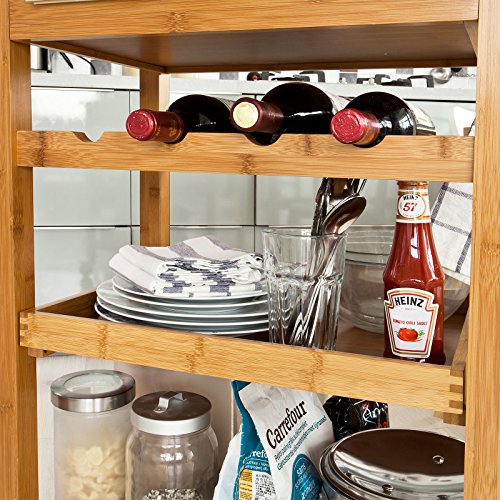 - Feature : The item make 20% discount until 23th,June / Dimensions: L58 x W40 x H90 cm; Material: 100% natural Bamboo, varnished. / Load Capacity: Total trolley: 25 kg . Worktop: 10 kg. / Includes one tempered glass top, one drawer, one wine rack, / One removable tray, one storage shelf and two towel hooks;Super convenient kitchen trolley with large and solid storage space and lockable wheels.