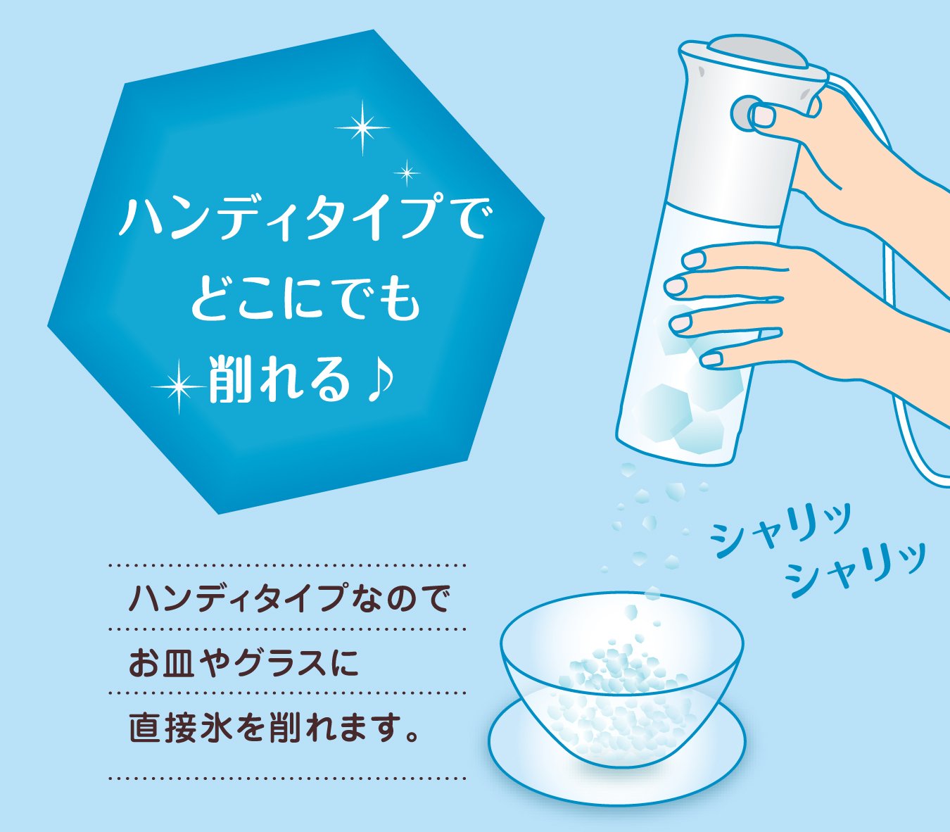 You can sharpen the ice of the shariari directly to a dish or a glass just by putting ice in the main body, holding it with your hand and pushing the switch.