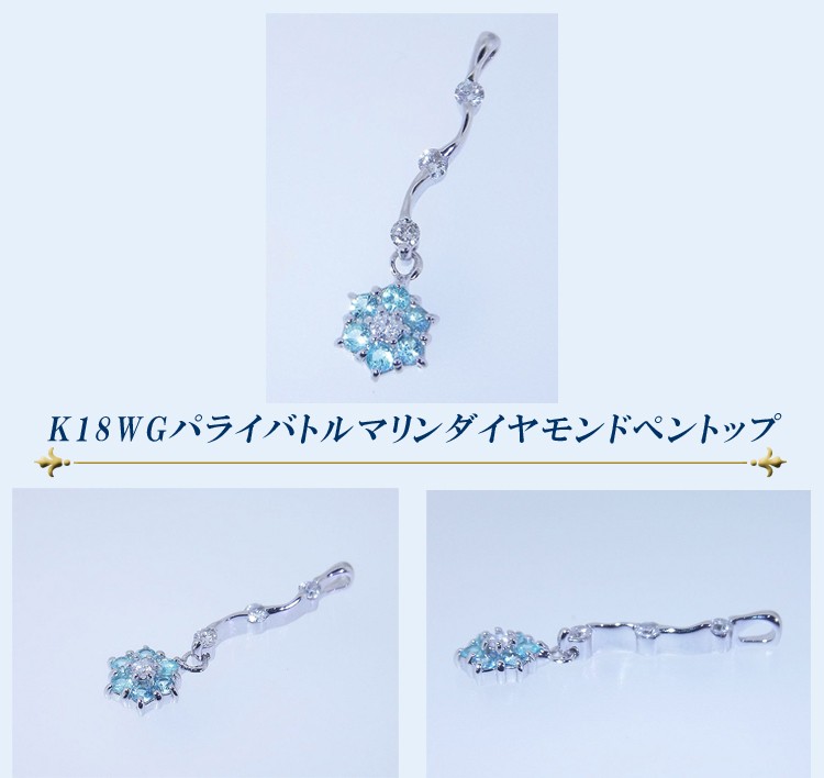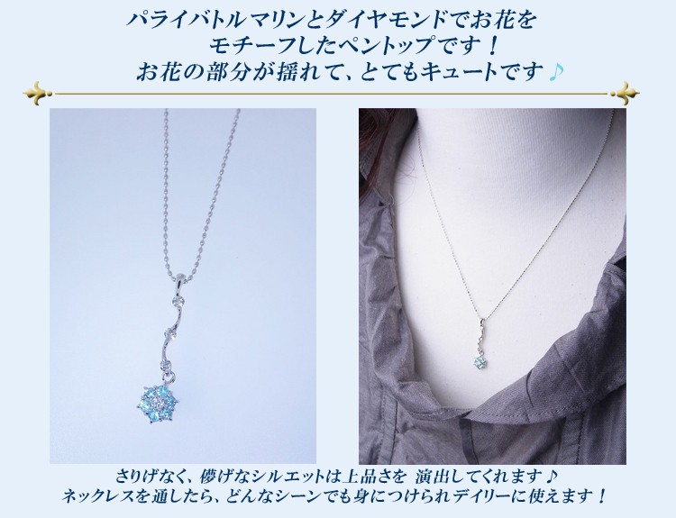 商品説明 パライバトルマリンとダイヤモンドでお花をモチーフしたK18ホワイトゴールドのペンダントトップです。お花の部分が揺れて、とてもかわいいです。
