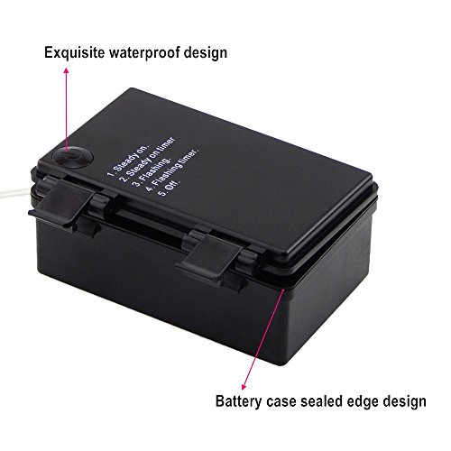 - Newest Indoor and Outdoor Weatherproof Transparent Battery Box with ON / Flash/ OFF and Timer(6 hours on and 18 hours off) Feature,Requires 6*AA Batteries (Not Included). It Has Locking Clips to Easy Open and Close the Box.